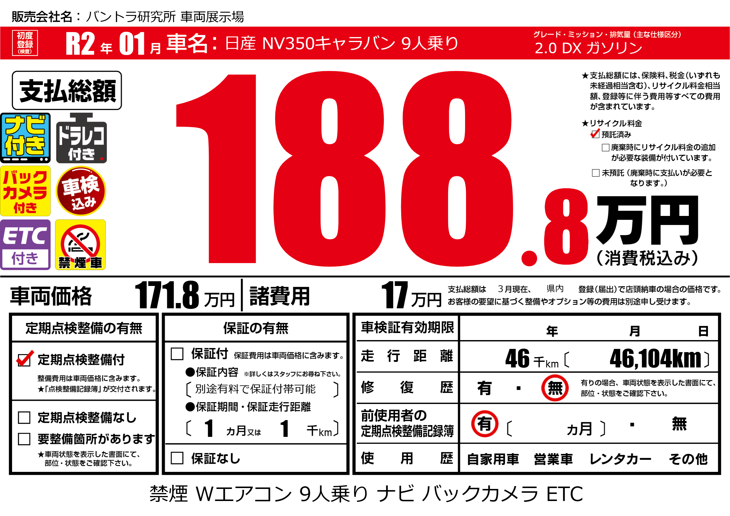 | 車名 | 日産 NV350キャラバン 9人乗り | グレード ミッション 排気量 |