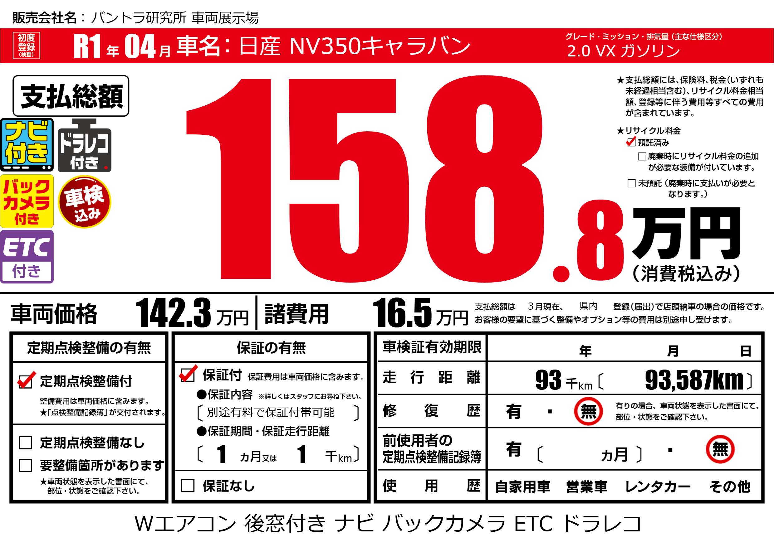 | 車名 | 日産 NV350キャラバン | グレード ミッション 排気量 |