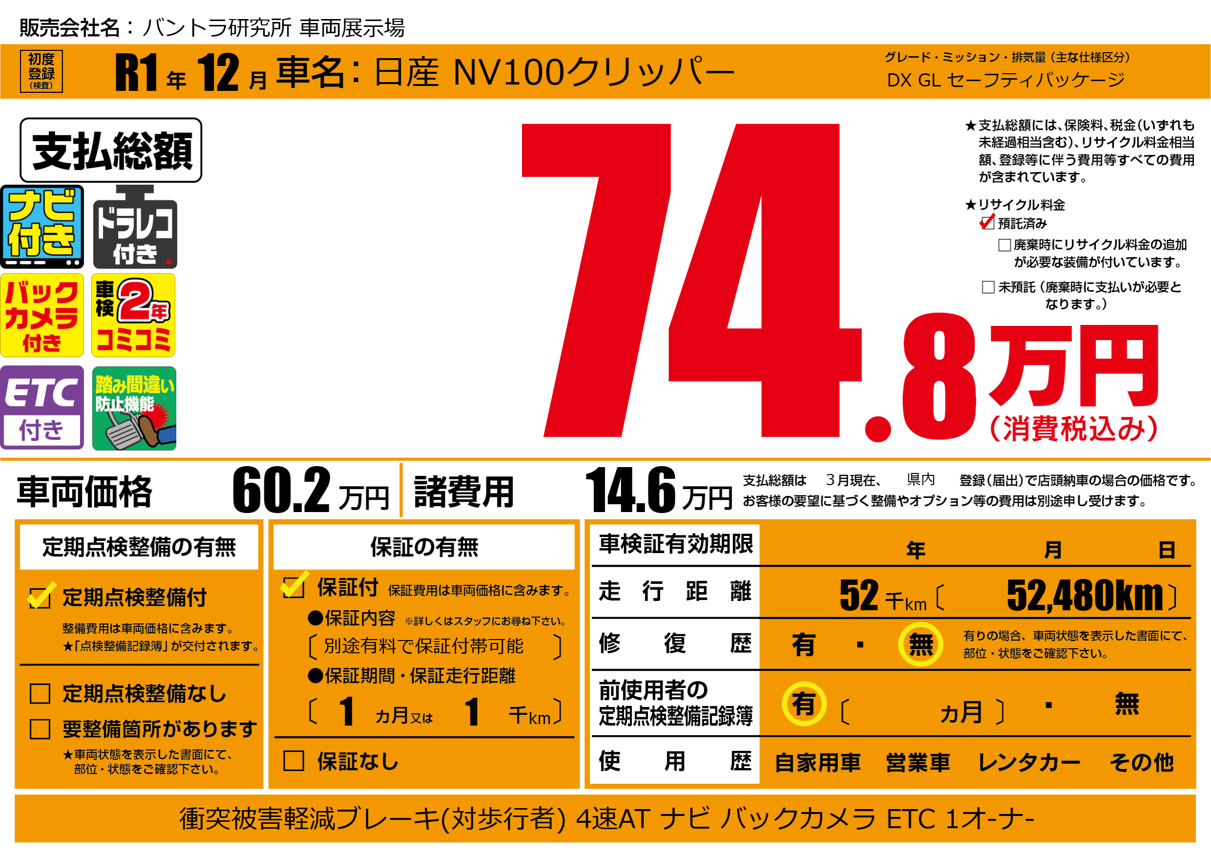 | 車名 | 日産 NV100クリッパー | グレード ミッション 排気量 |