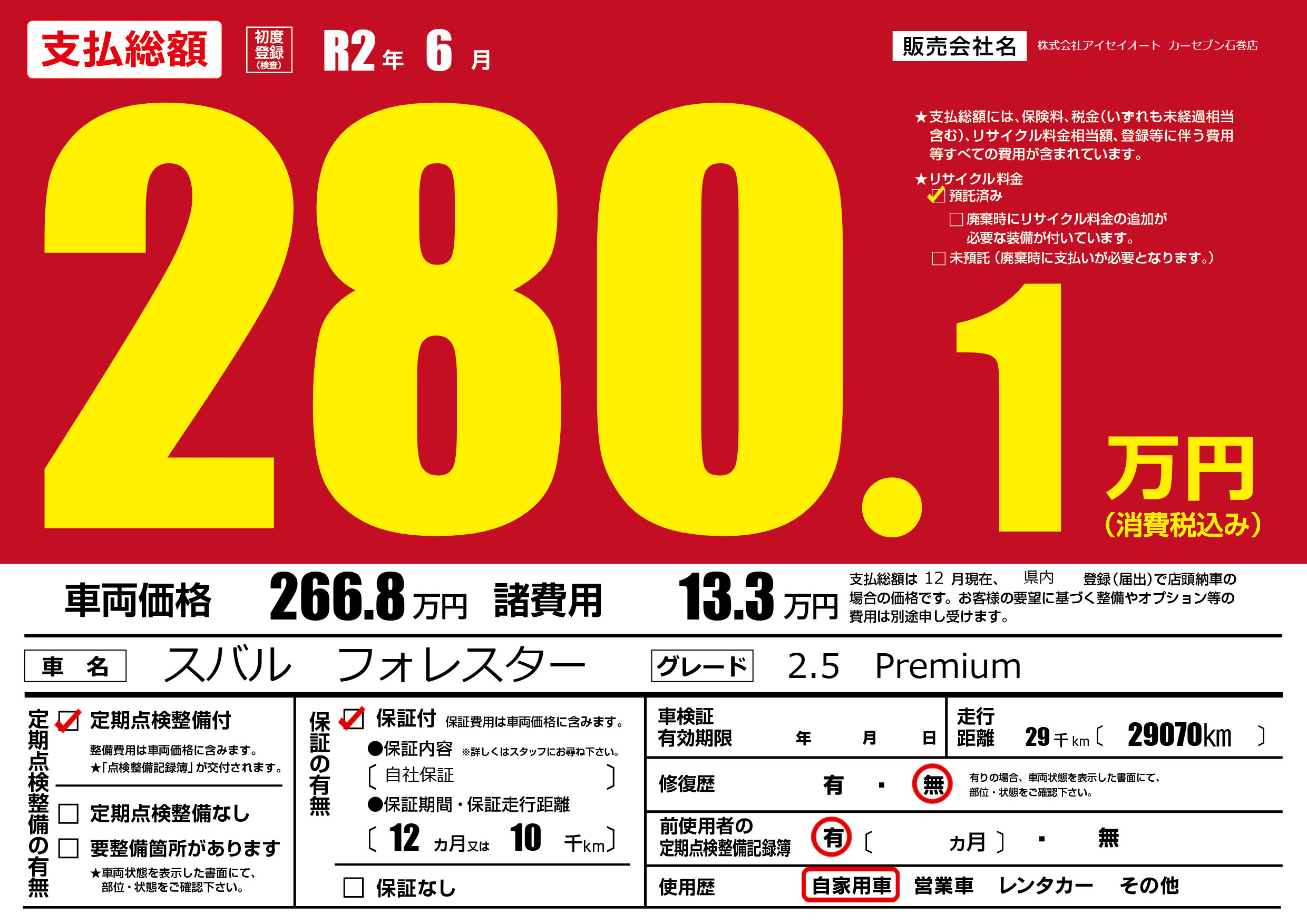 | 車名 | スバル フォレスター | グレード ミッション 排気量 |