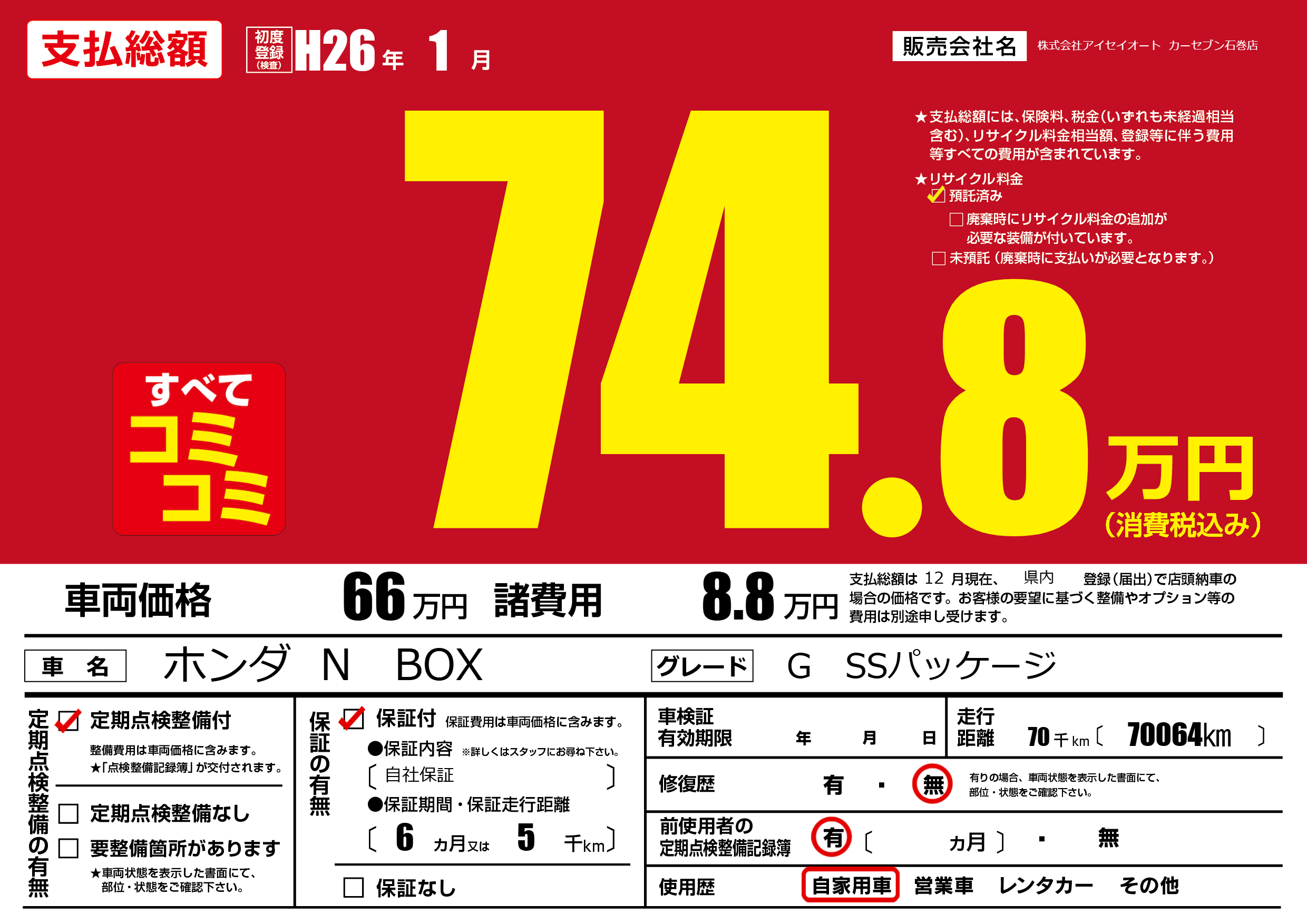 保証付き 保証内容(自社保証) 6ヶ月または(5)千kmまで |