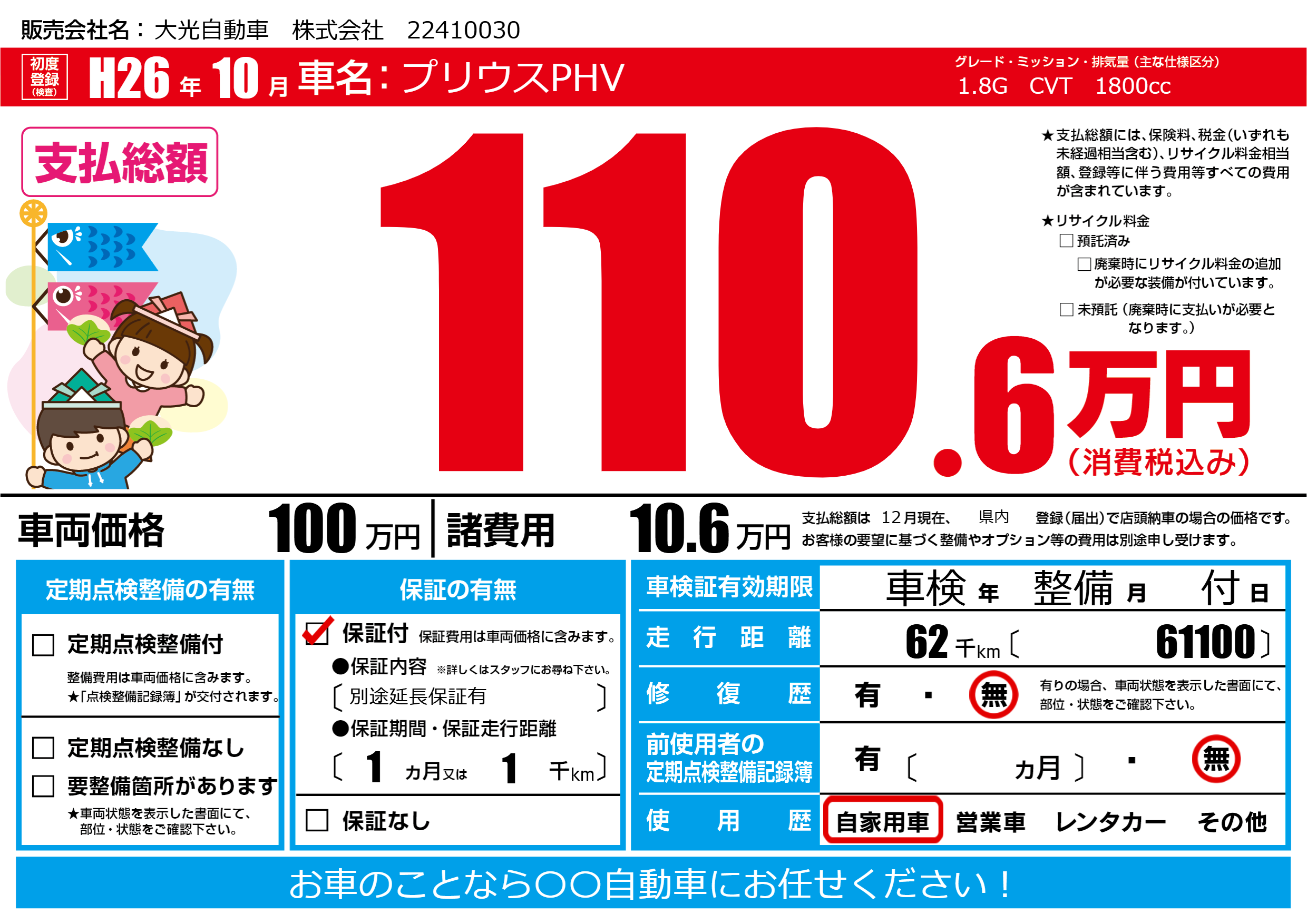 | 車名 | プリウスPHV | グレード ミッション 排気量 |