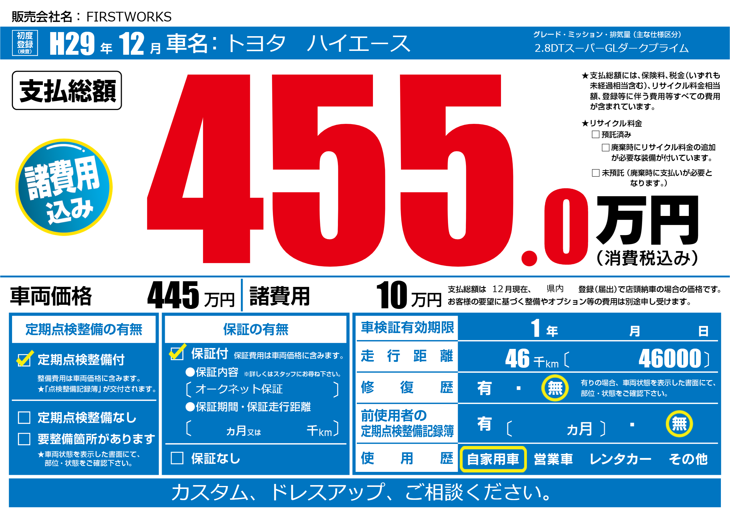 | 走行キロ | 4.6万km | 初年度登録 | H29年12月 |