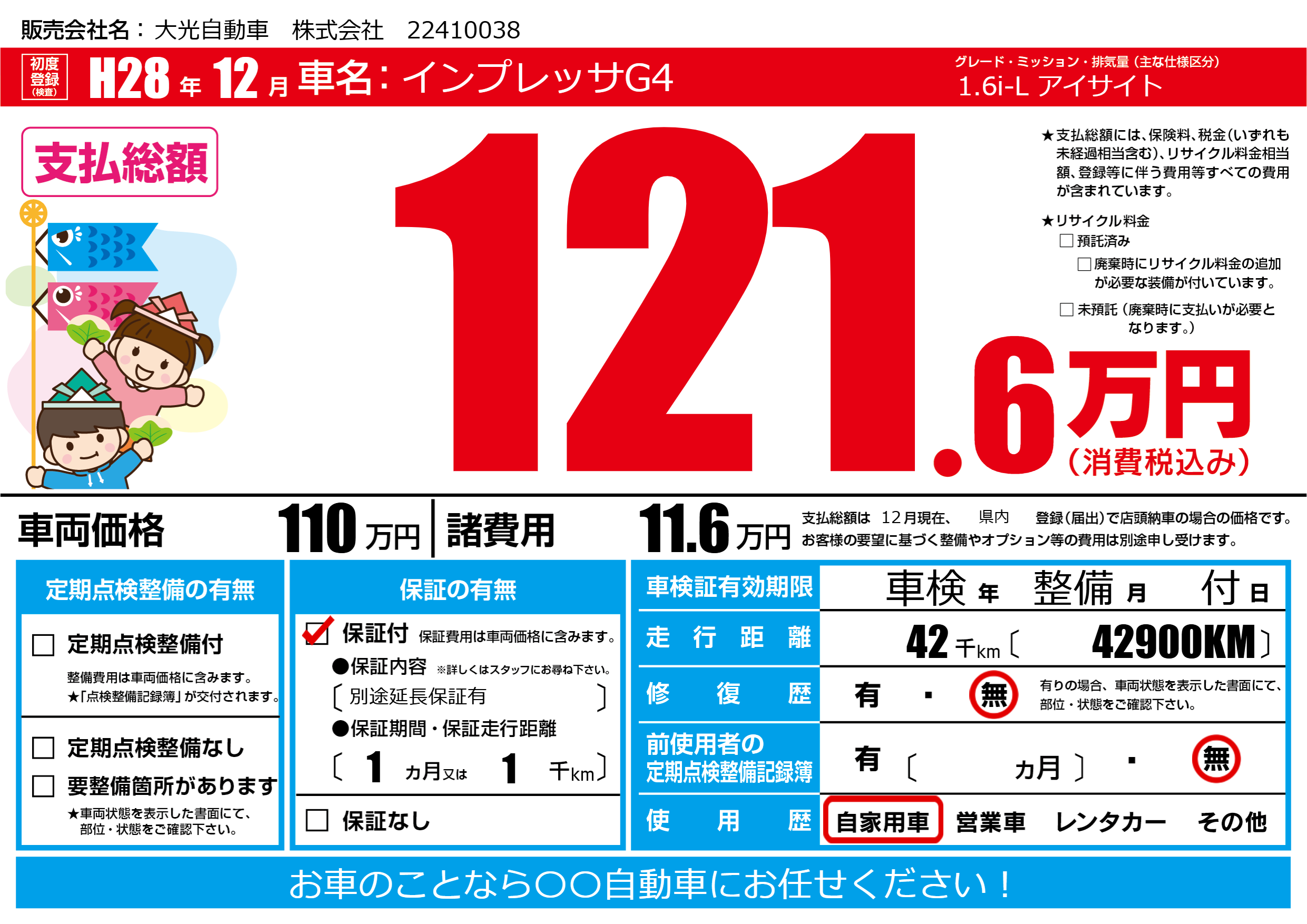 | 車名 | インプレッサG4 | グレード ミッション 排気量 |