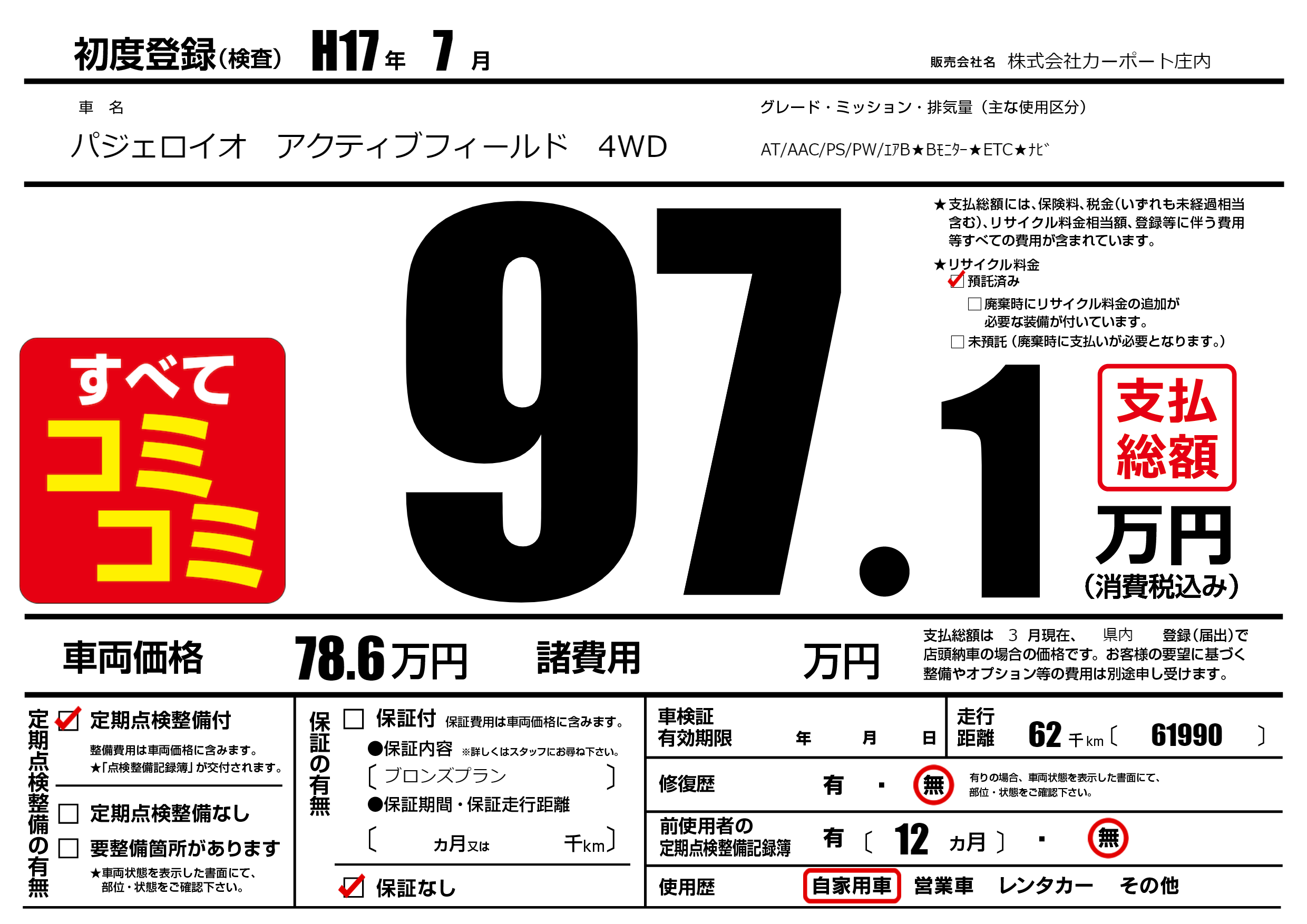 | 車名 | パジェロイオ アクティブフィールド 4WD | グレード ミッション 排気量 |