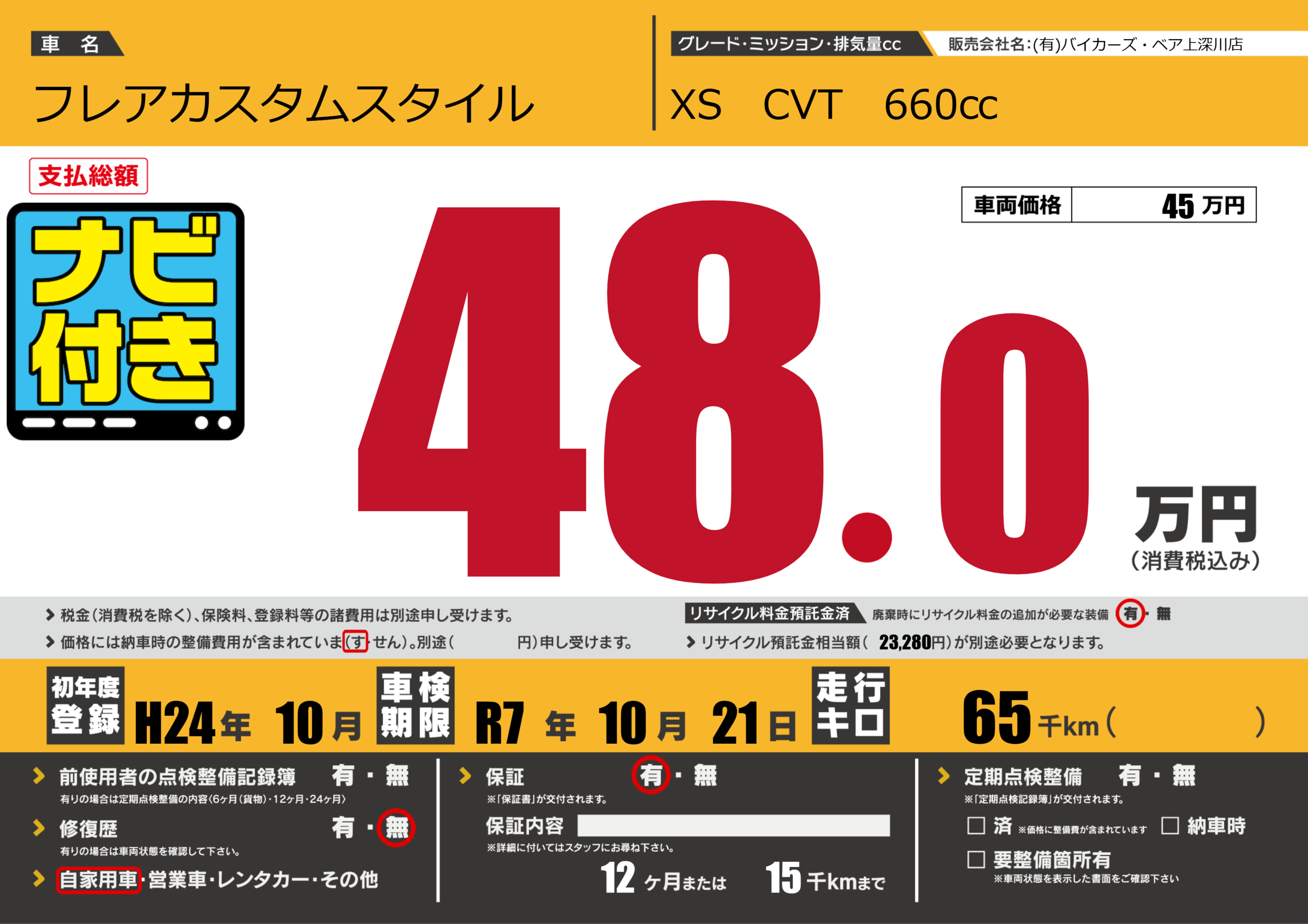| 走行キロ | 6.5万km | 初年度登録 | H24年10月 |