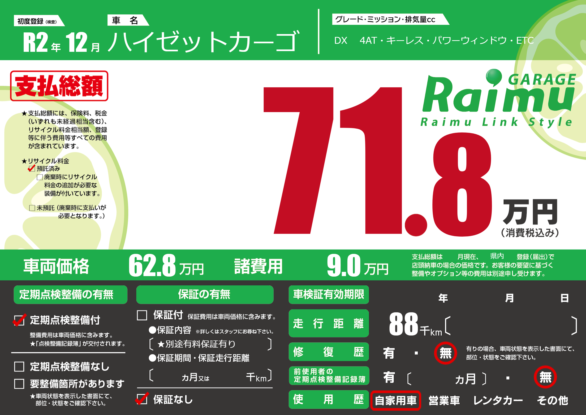 保証なし 保証内容(★別途有料保証有り) ---ヶ月または()千kmまで |