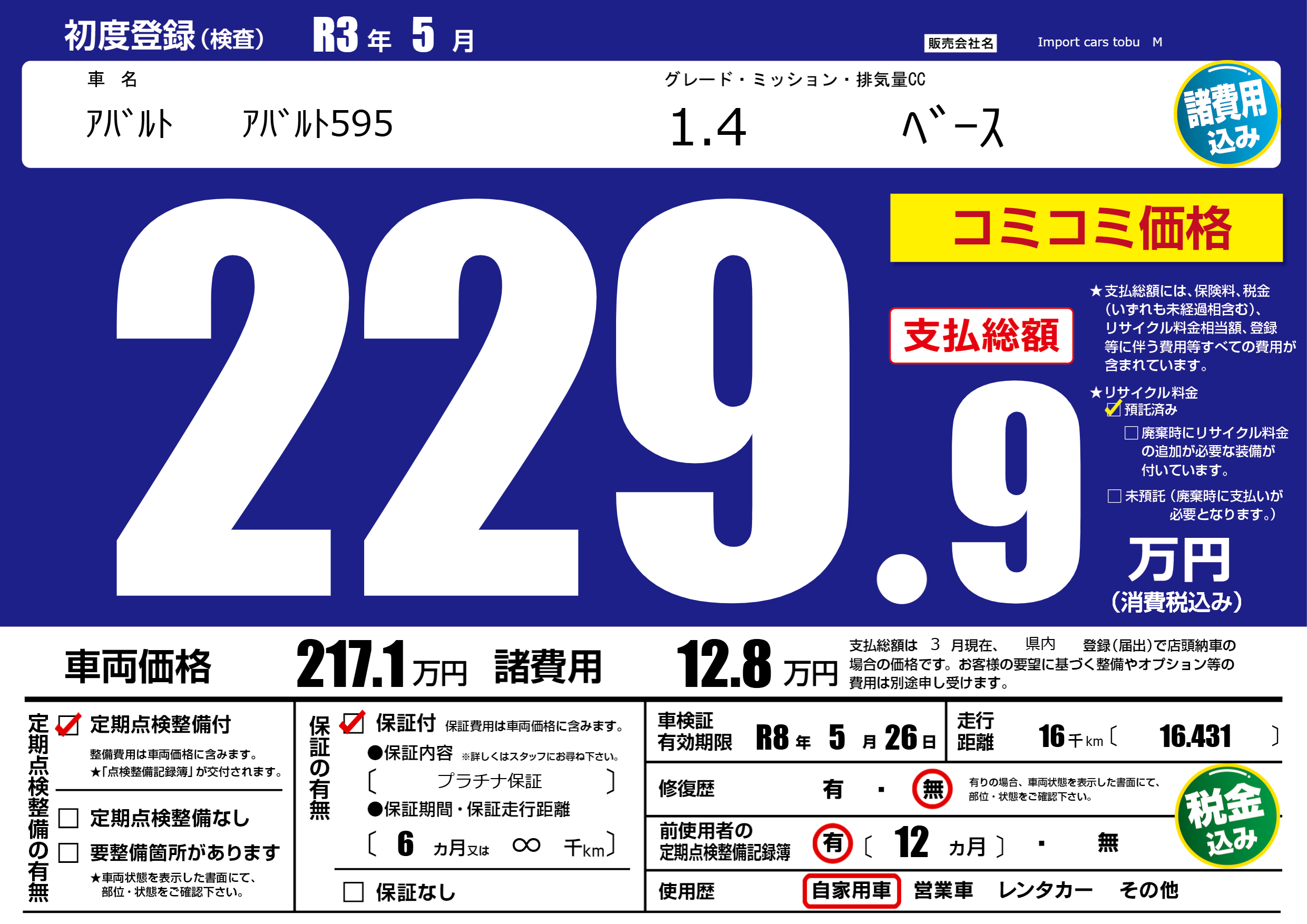| 車名 | アバルト アバルト595 | グレード ミッション 排気量 |