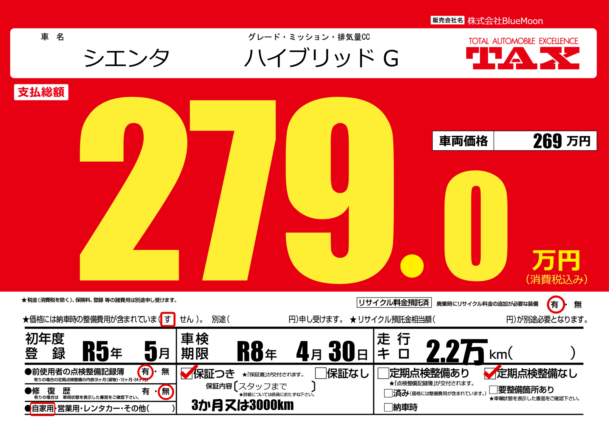 | 車名 | シエンタ | グレード ミッション 排気量 |