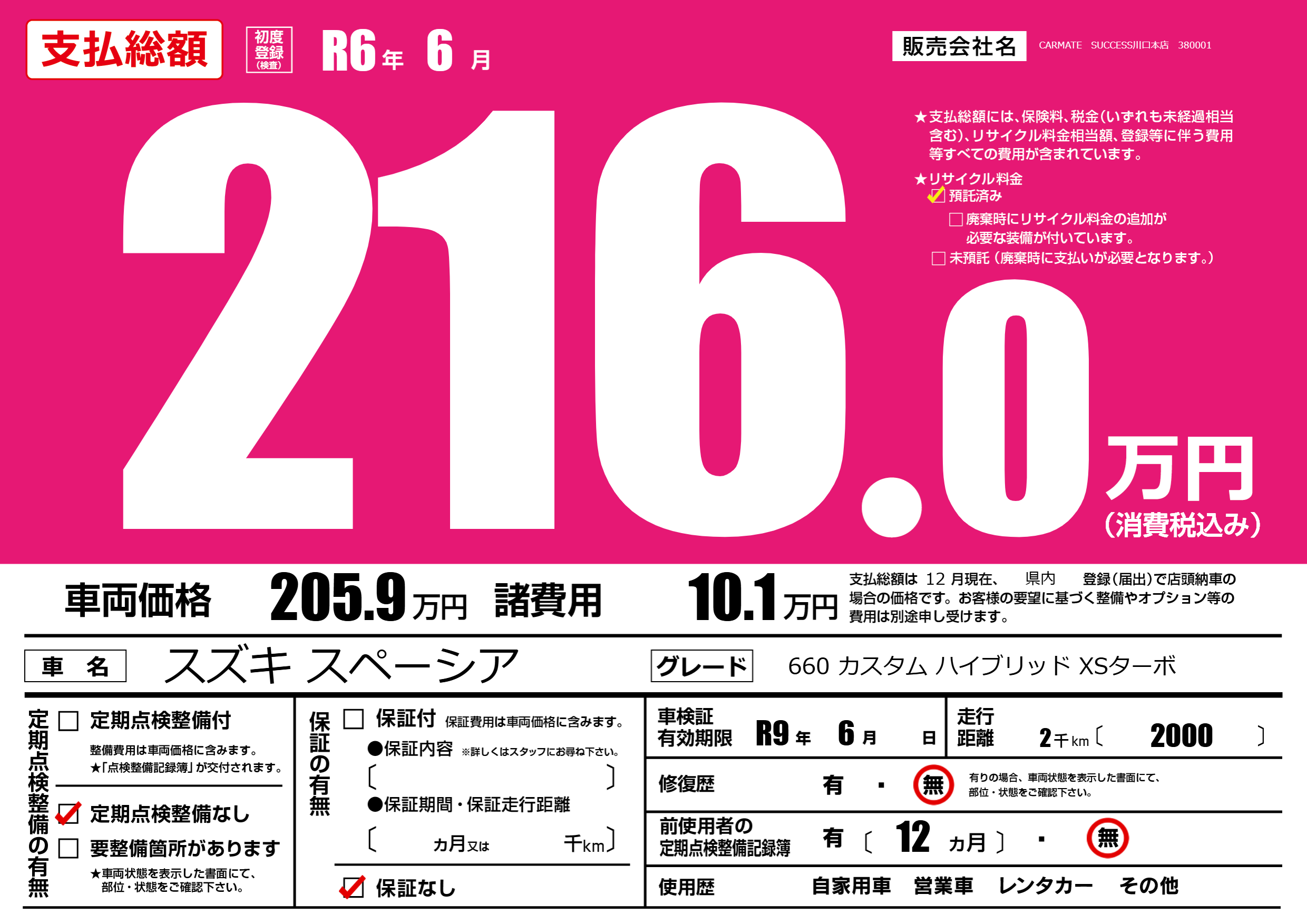| 車名 | スズキ スペーシア | グレード ミッション 排気量 |