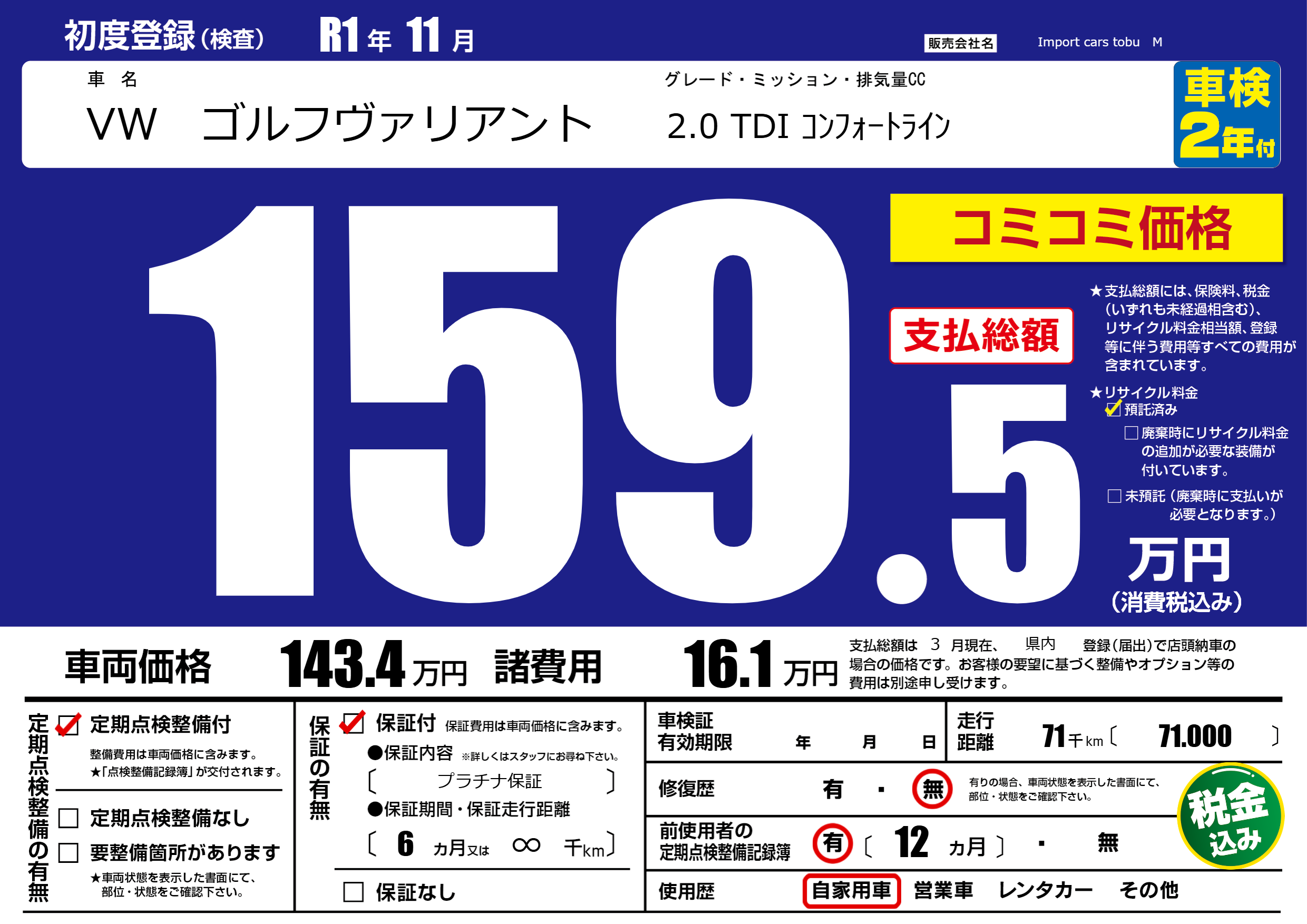| 車名 | VW ゴルフヴァリアント | グレード ミッション 排気量 |