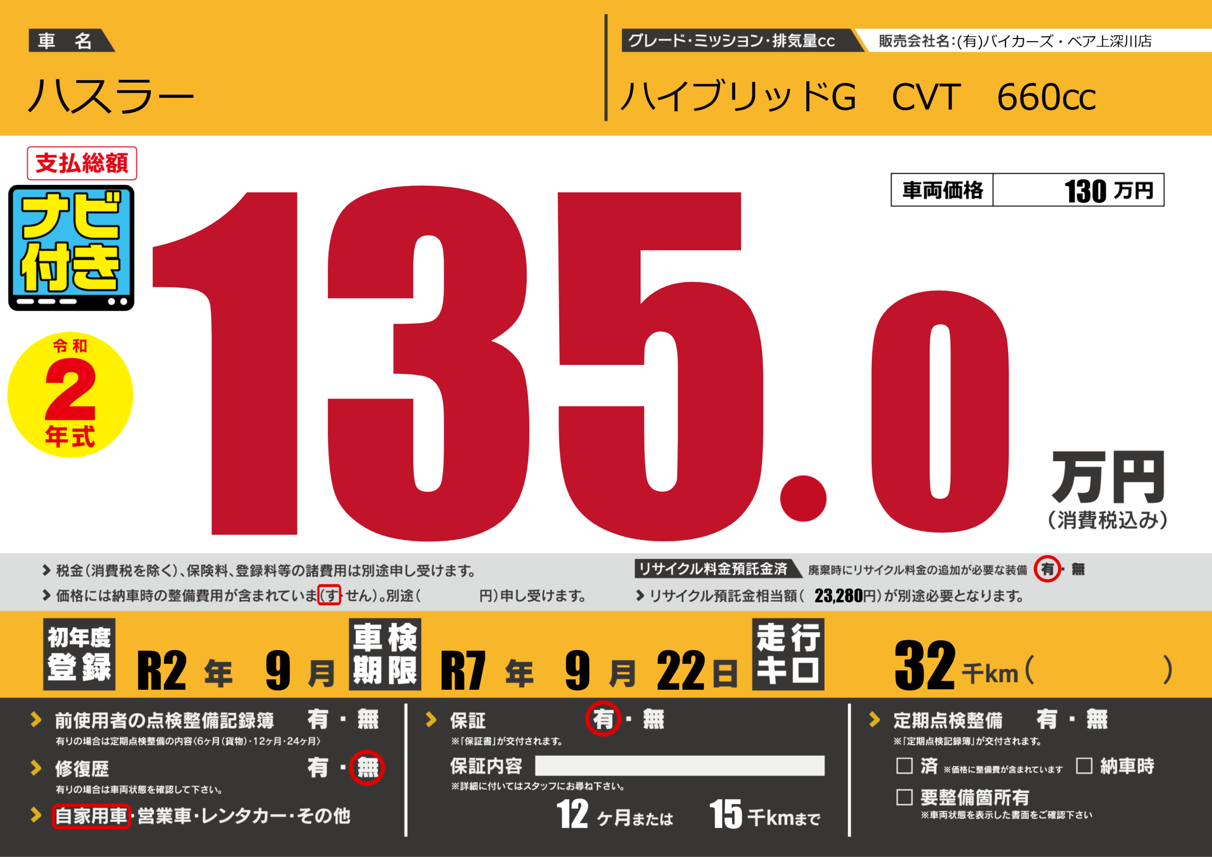 | 走行キロ | 3.2万km | 初年度登録 | R2年9月 |