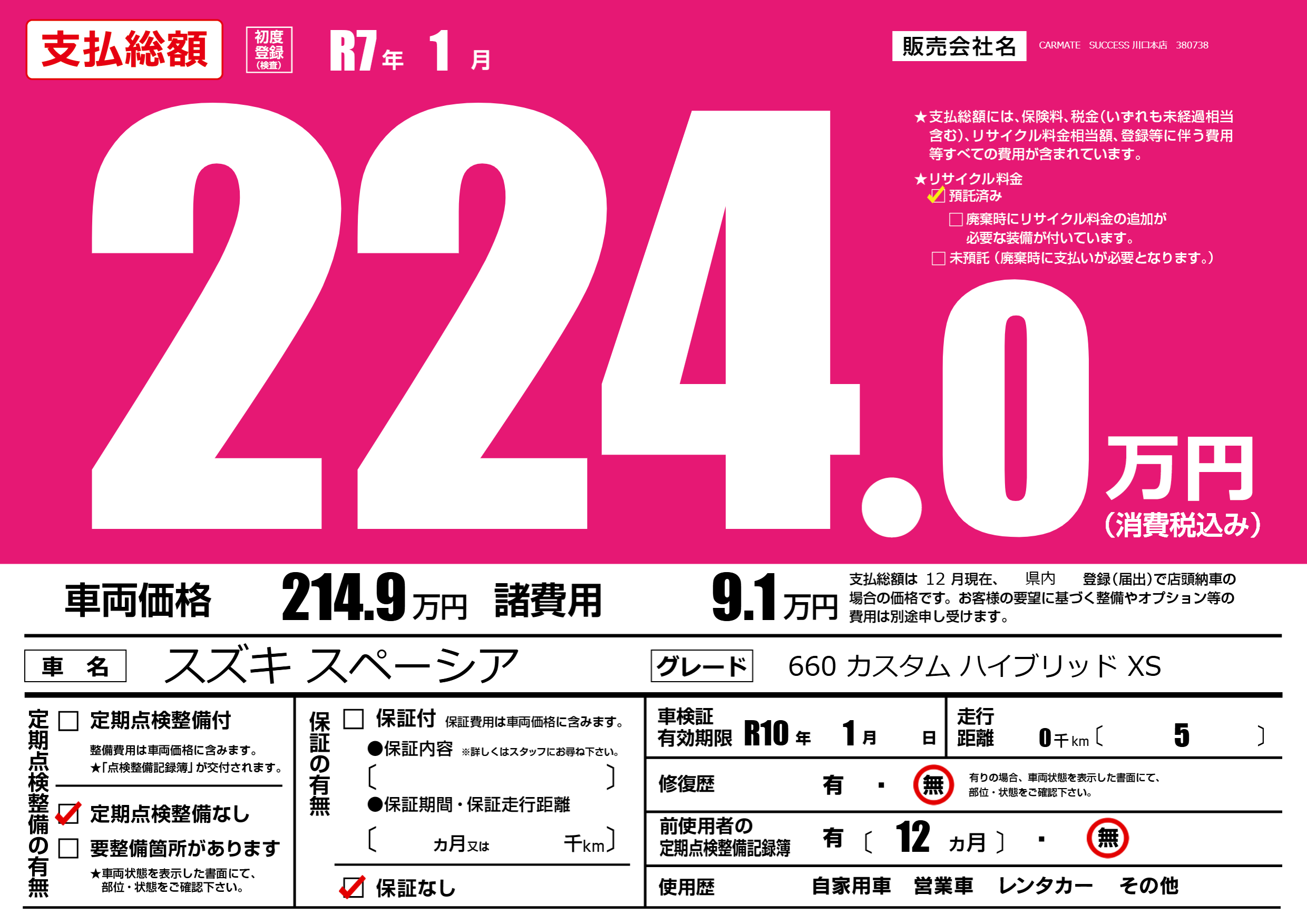 | 車名 | スズキ スペーシア | グレード ミッション 排気量 |