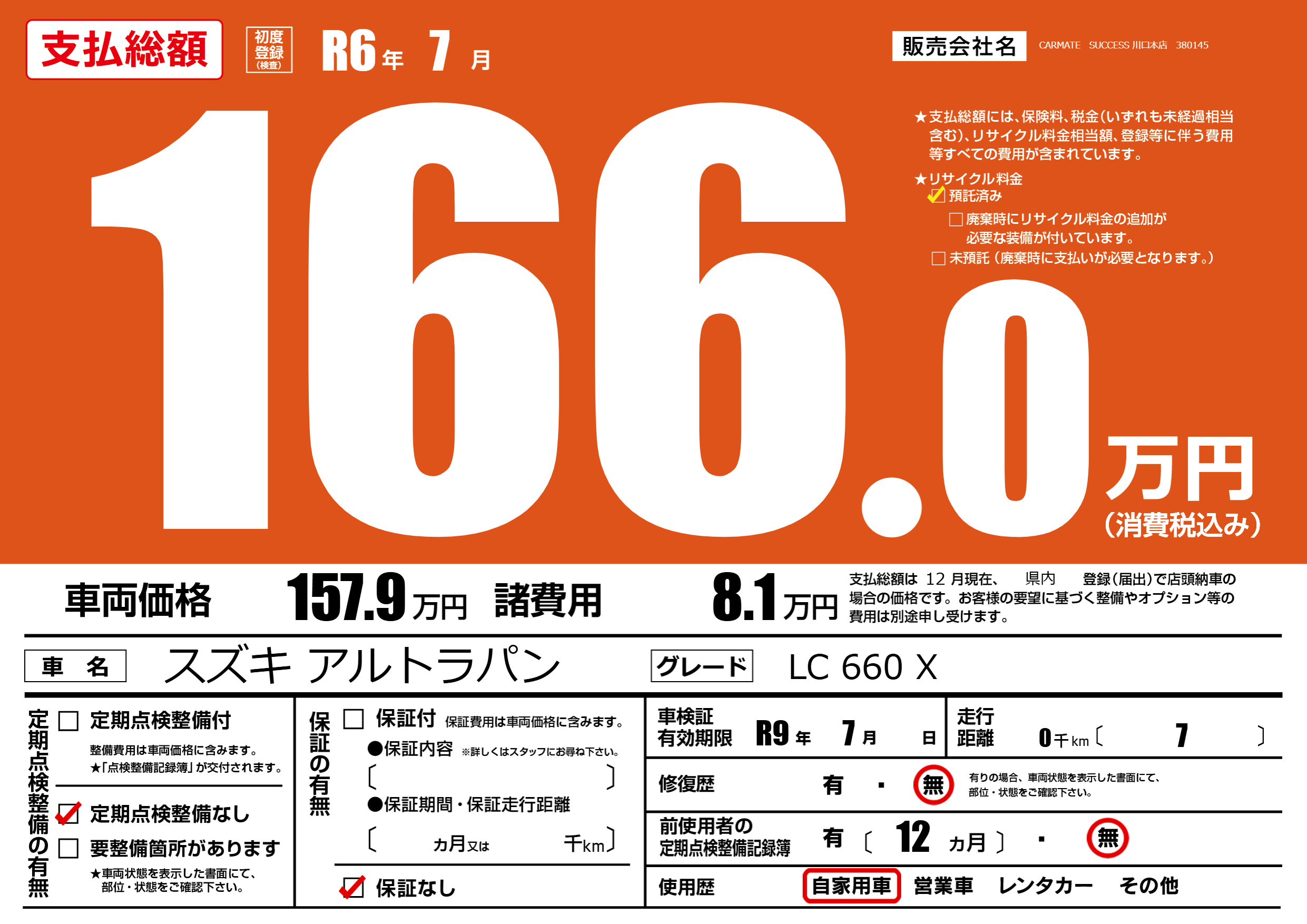 | 走行キロ | - | 初年度登録 | R6年7月 |
