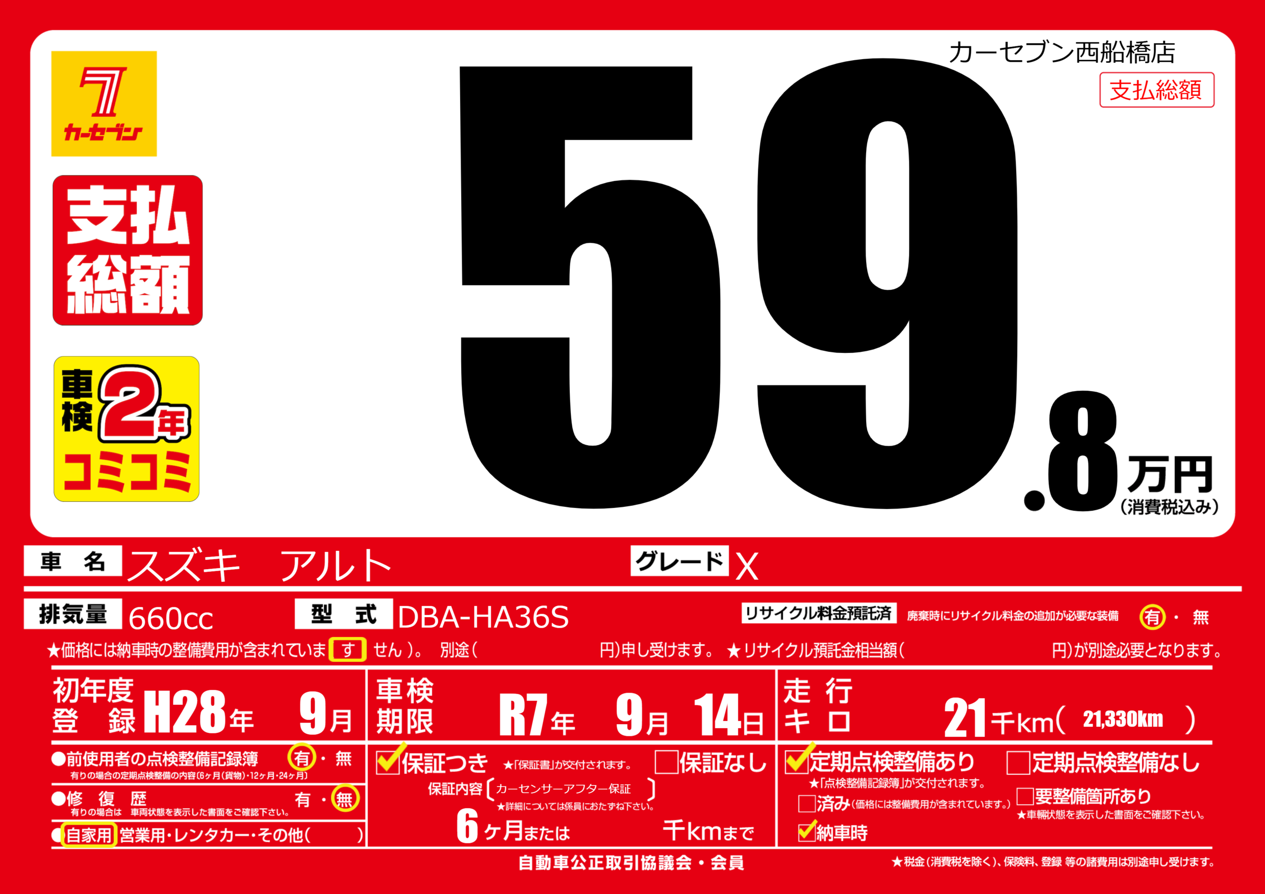 | 定期点検整備 | 定期点検整備あり 納車時あり | ||