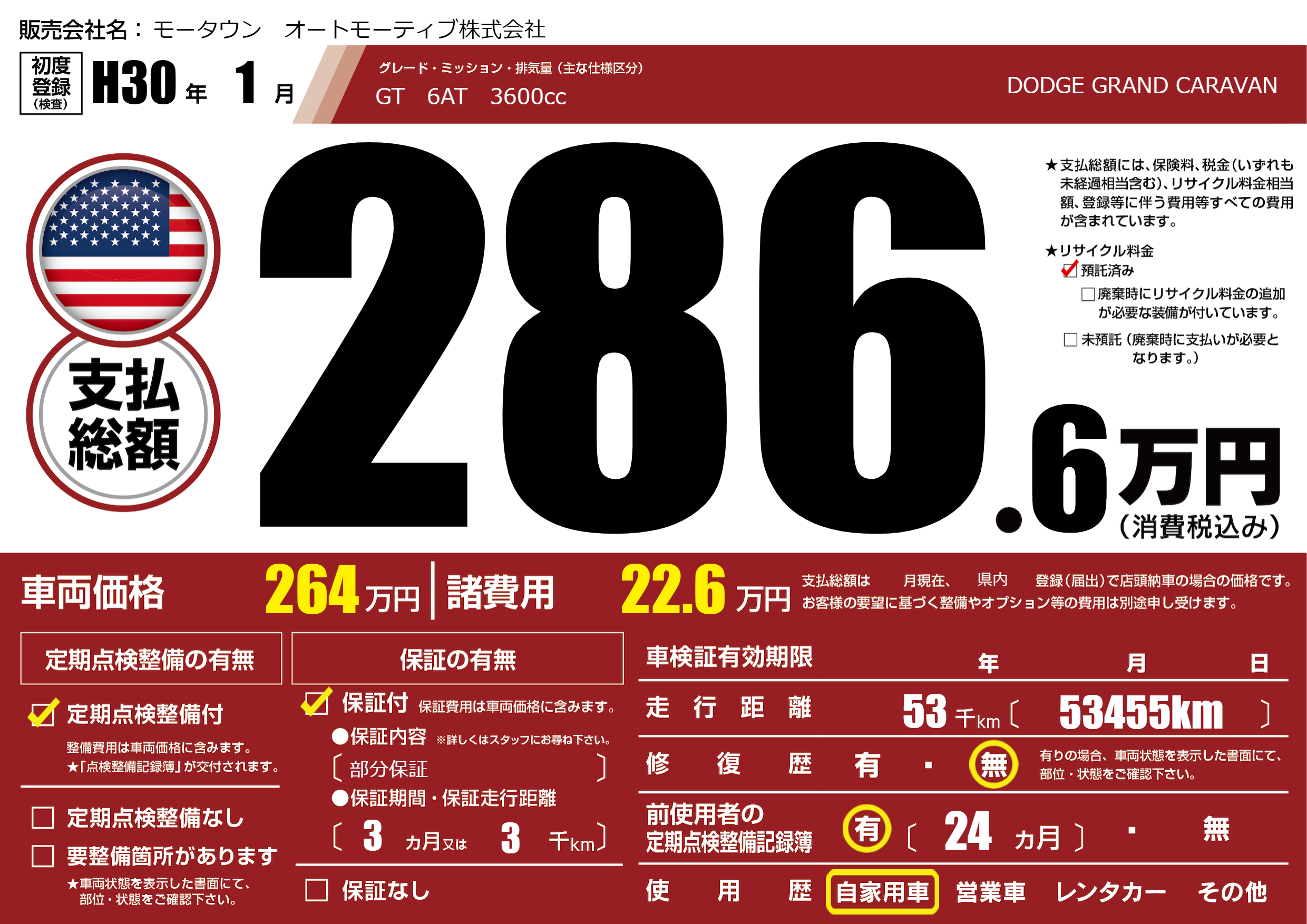 | 車名 | DODGE GRAND CARAVAN | グレード ミッション 排気量 |