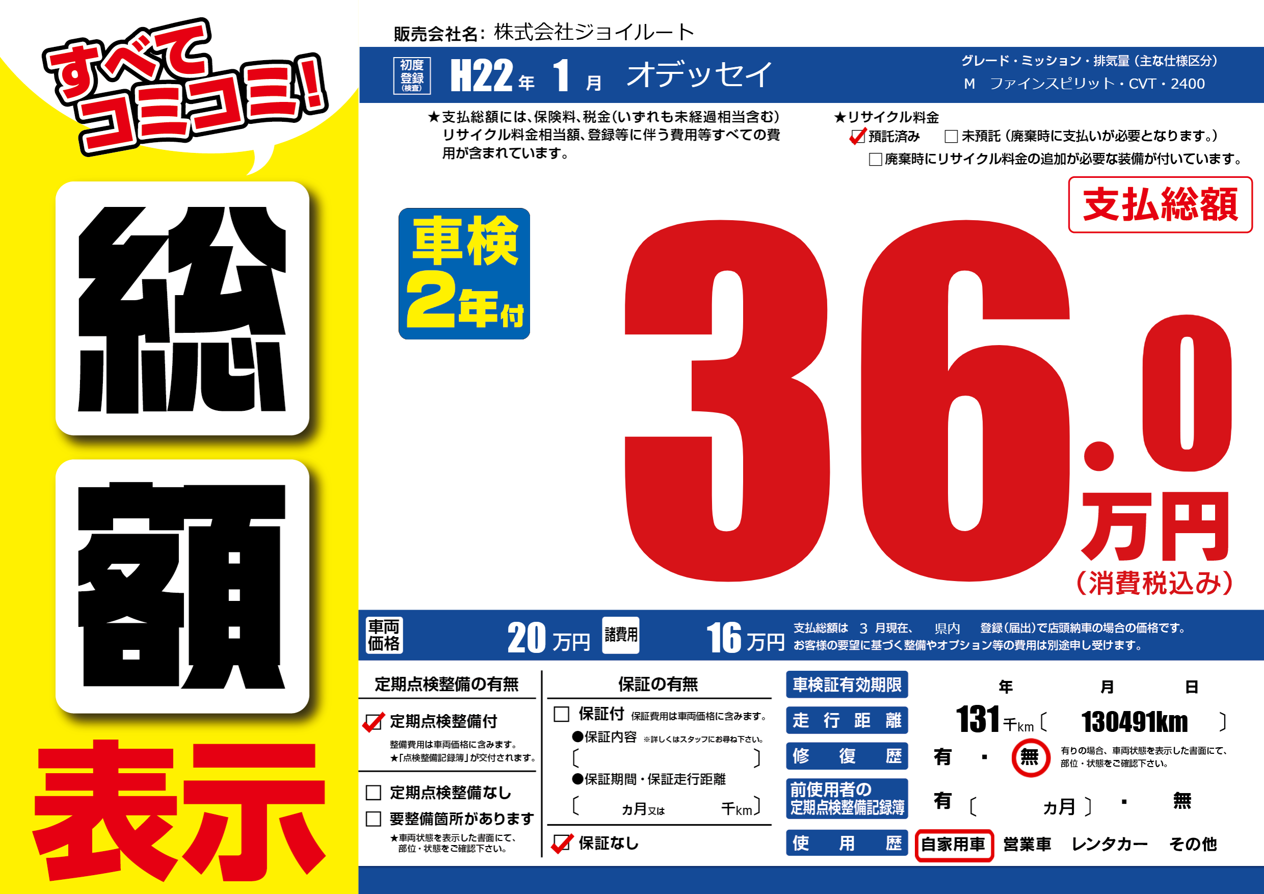 | 車名 | オデッセイ | グレード ミッション 排気量 |