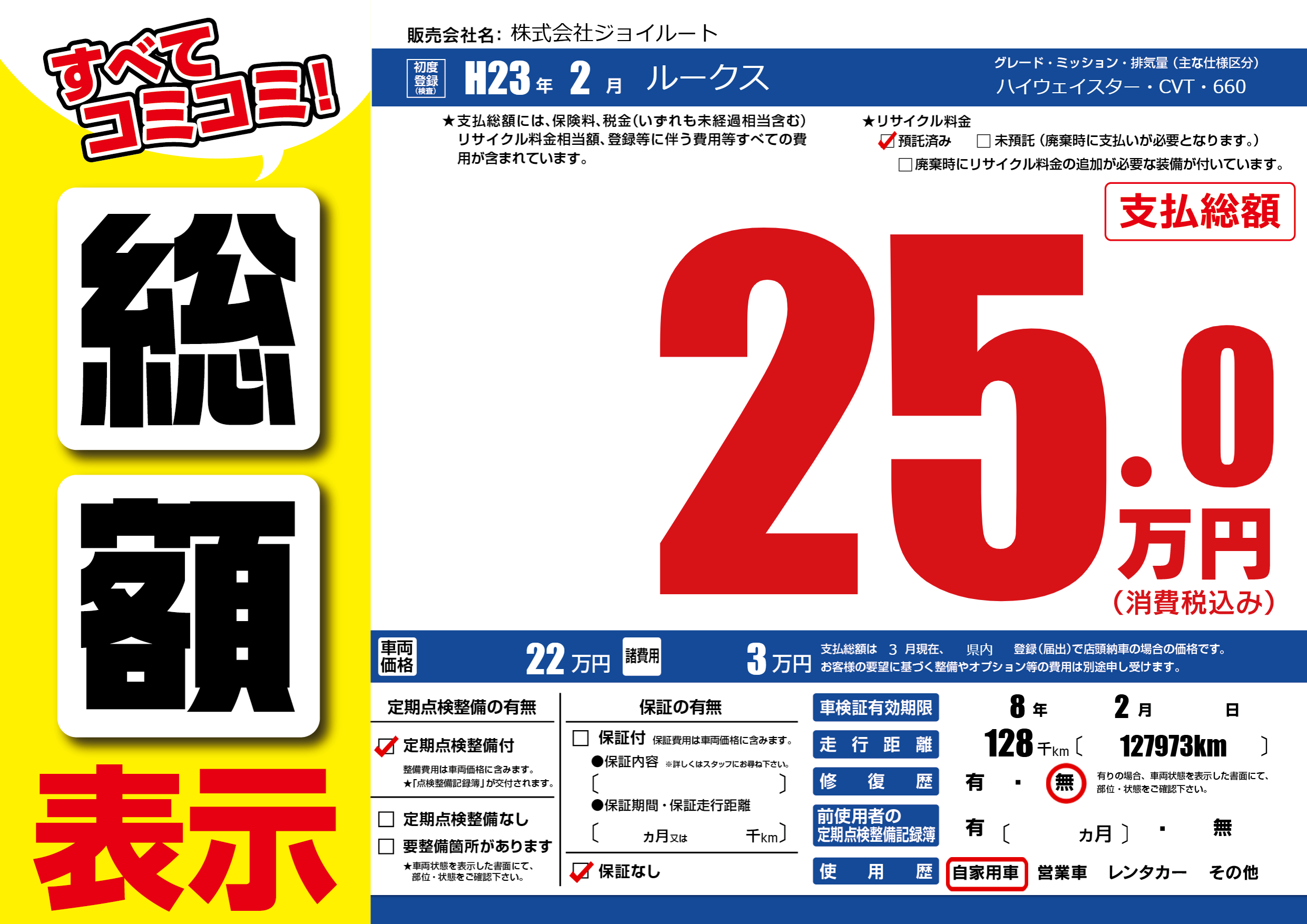 | 走行キロ | 12.8万km | 初年度登録 | H23年2月 |