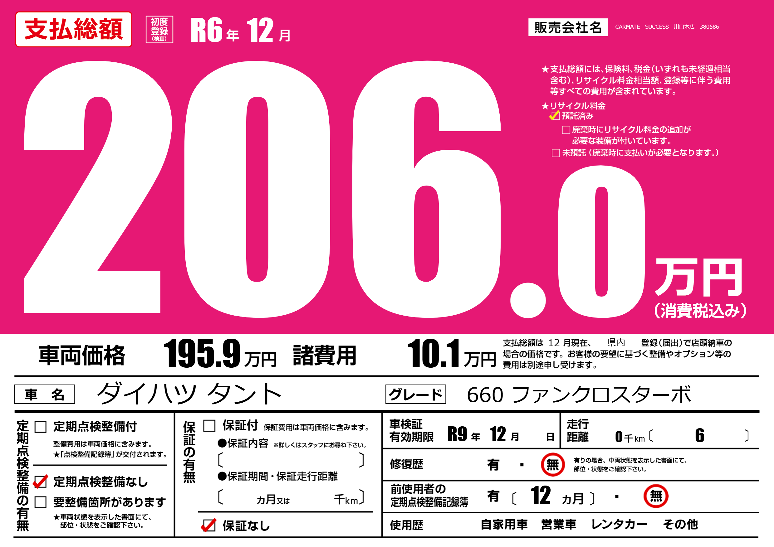 なし | 車検制限 | R9年12月---月 |