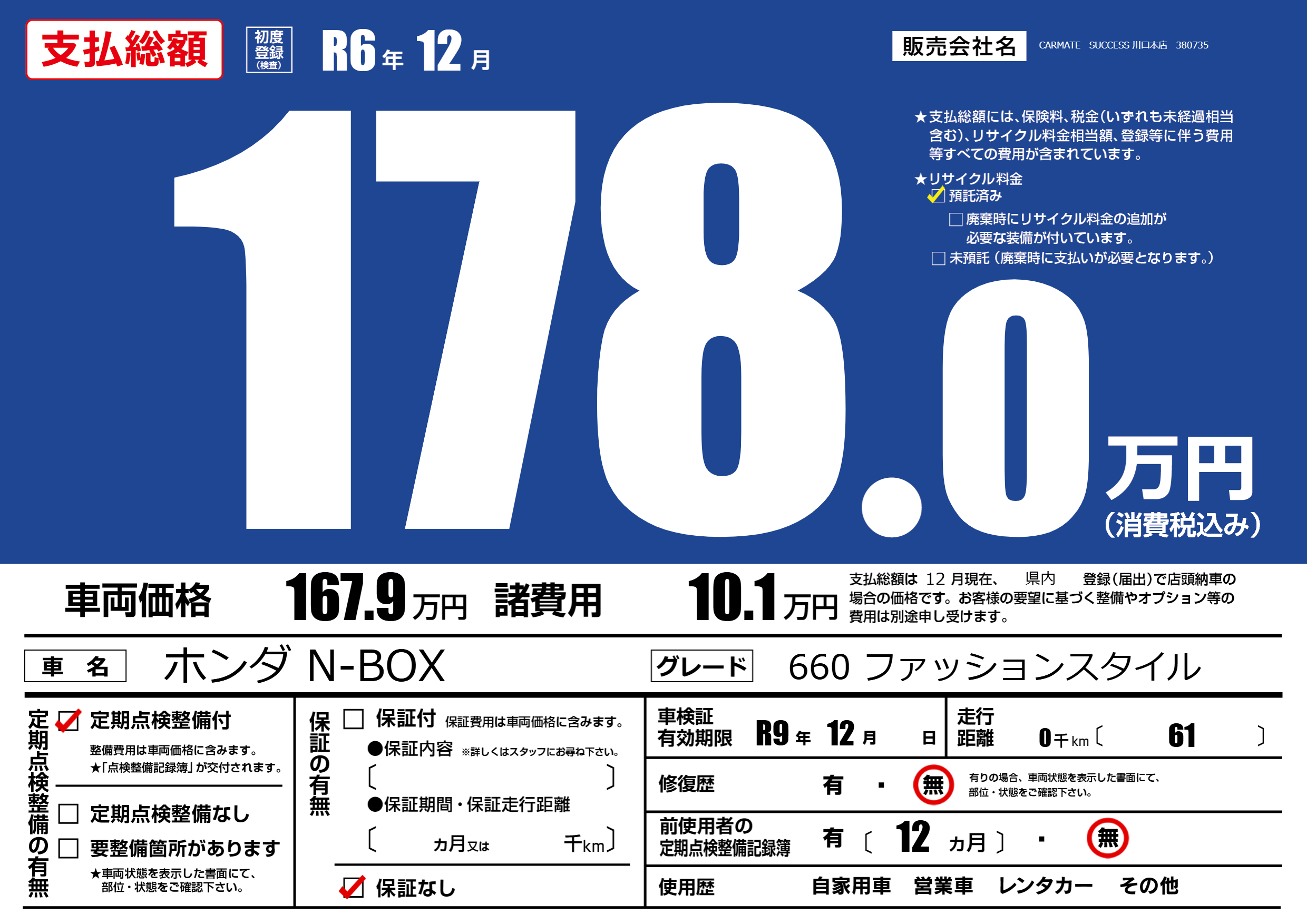 | 車名 | ホンダ N-BOX | グレード ミッション 排気量 |
