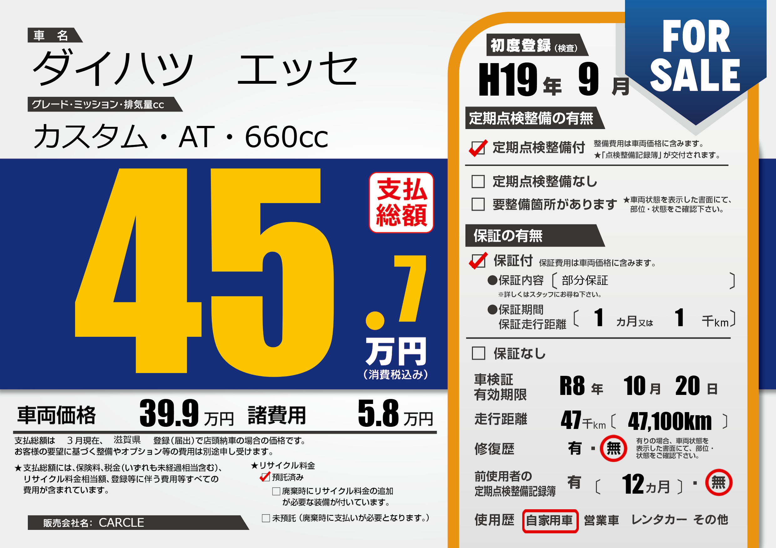 | 車名 | ダイハツ エッセ | グレード ミッション 排気量 |