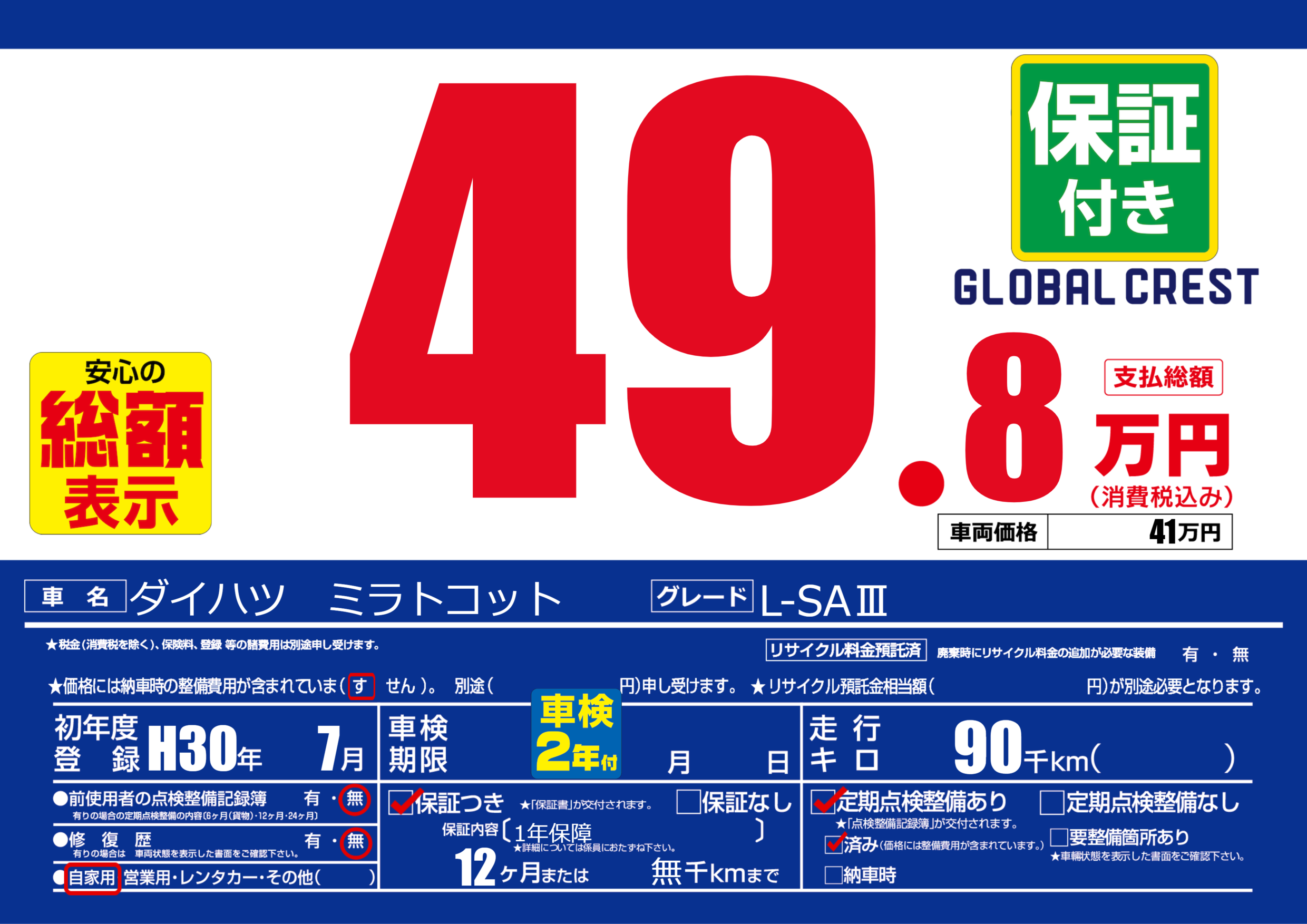 | 定期点検整備 | 定期点検整備あり 定期点検整備済み | ||
