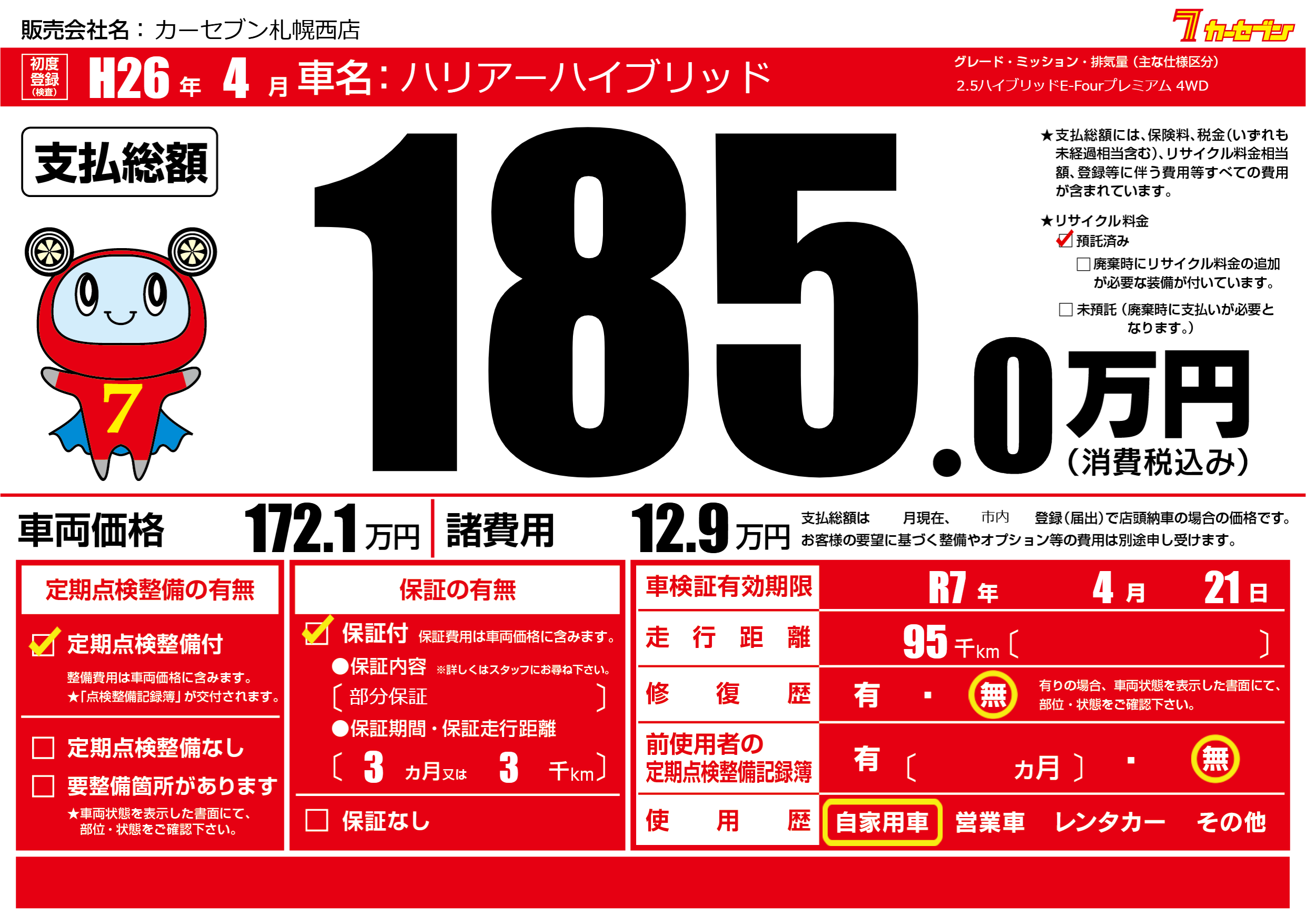 なし | 車検制限 | R7年4月21月 |