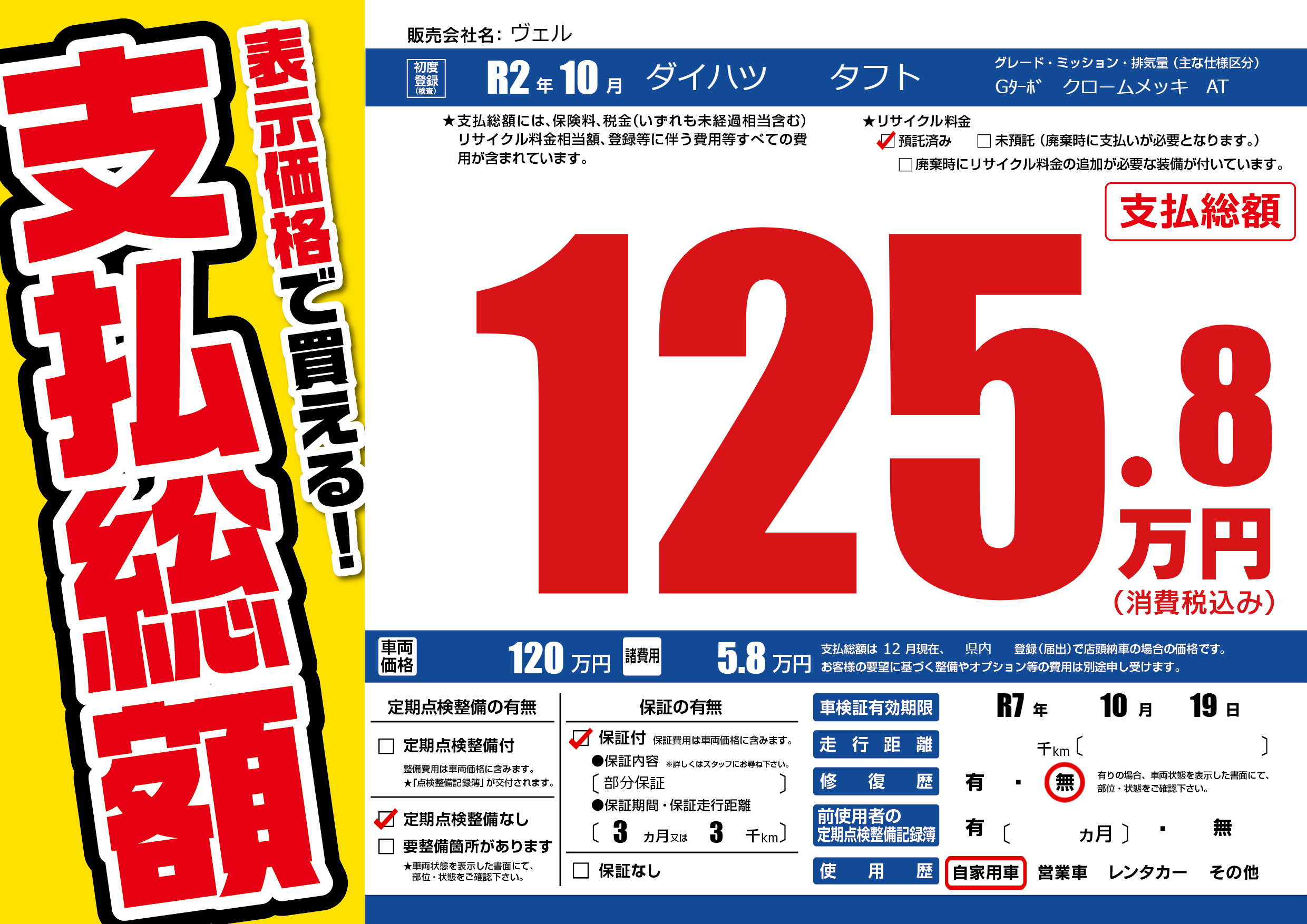 | 走行キロ | - | 初年度登録 | R2年10月 |