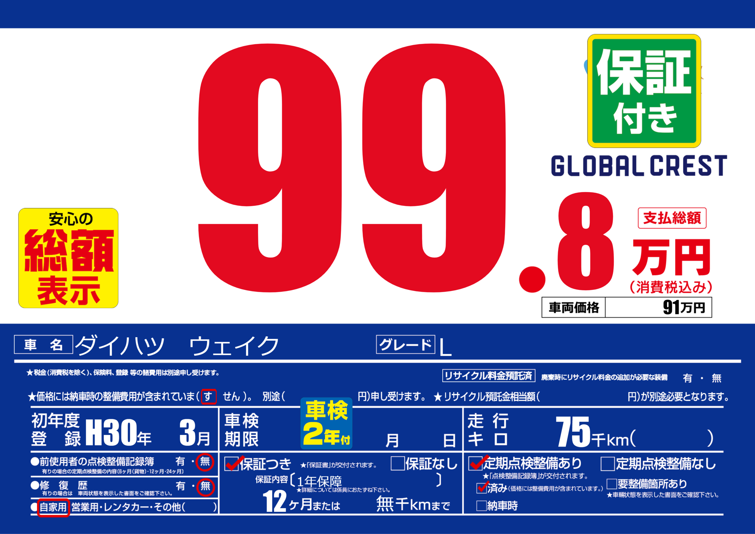 | 定期点検整備 | 定期点検整備あり 定期点検整備済み | ||