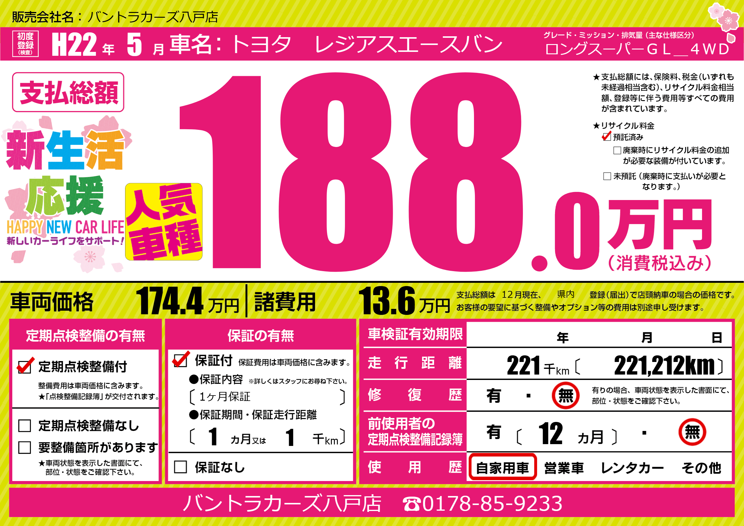 | 走行キロ | 22.1万km | 初年度登録 | H22年5月 |
