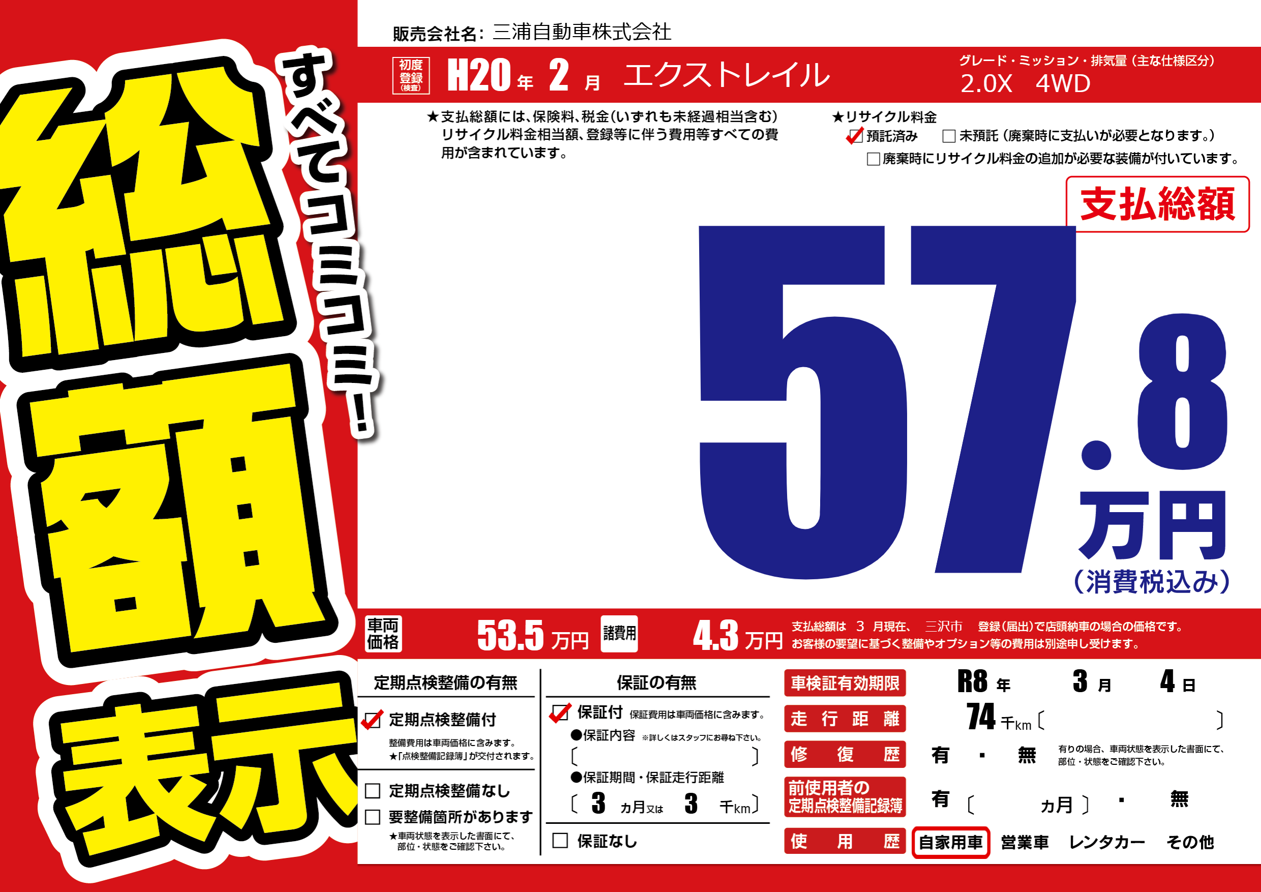 | 走行キロ | 7.4万km | 初年度登録 | H20年2月 |