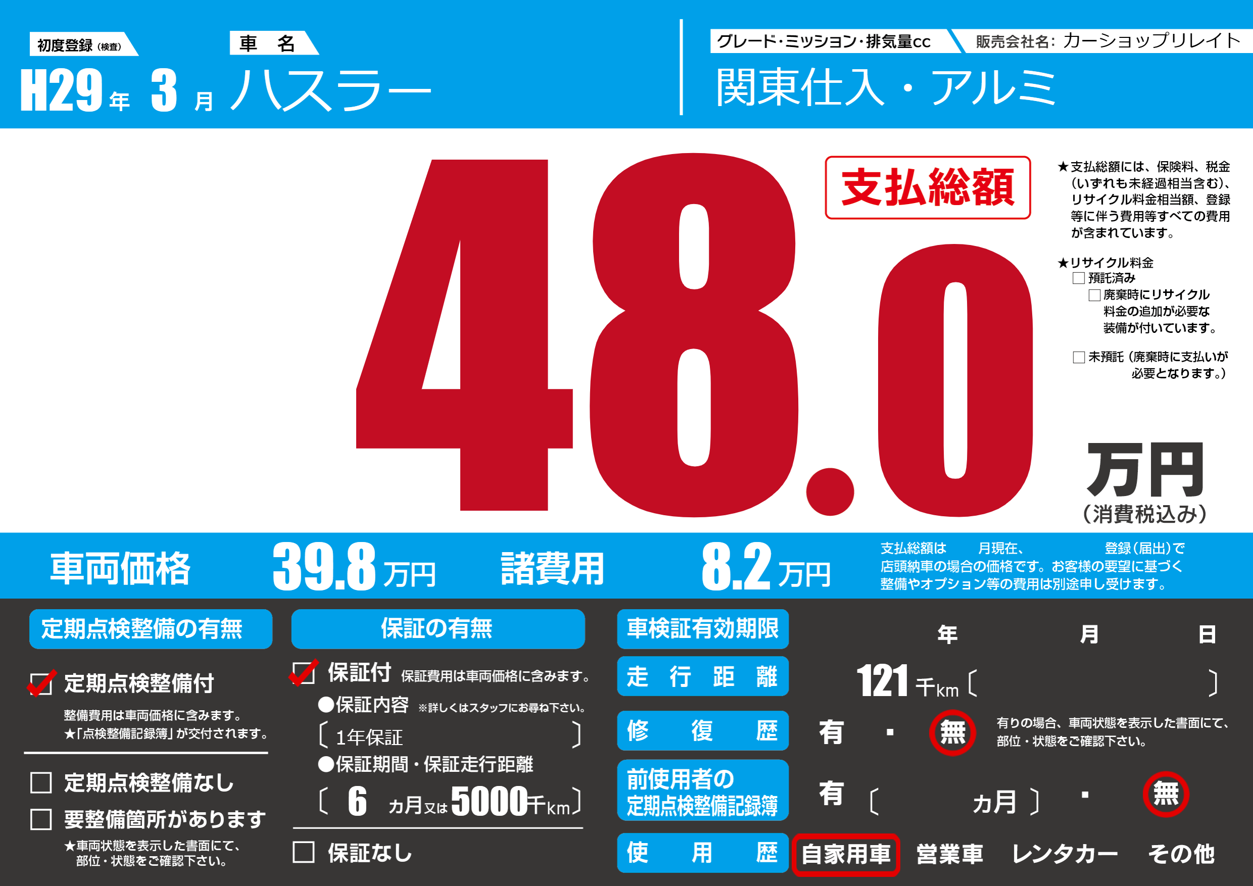 | 走行キロ | 12.1万km | 初年度登録 | H29年3月 |