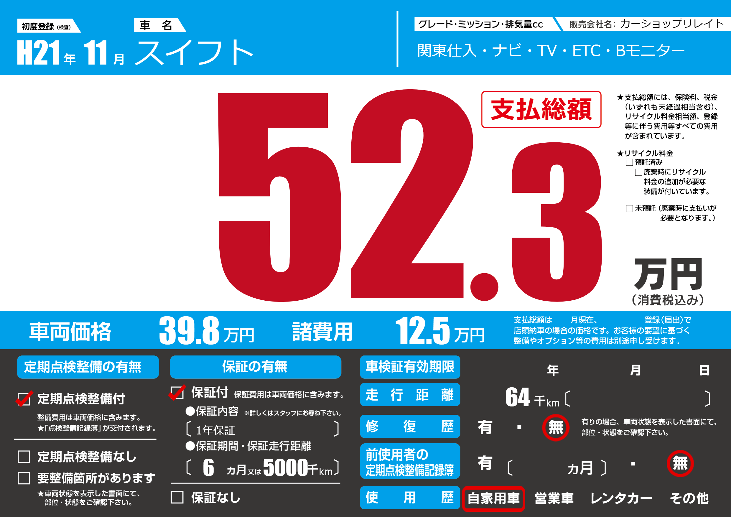 保証付き 保証内容(1年保証) 6ヶ月または(5000)千kmまで |