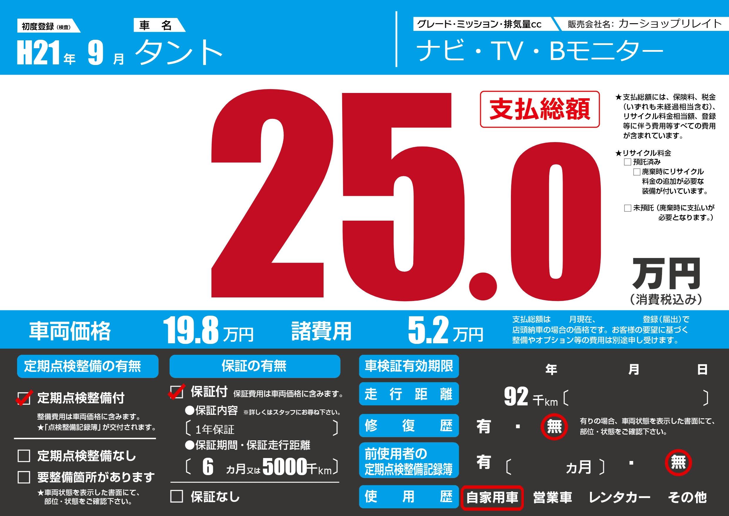 | 走行キロ | 9.2万km | 初年度登録 | H21年9月 |