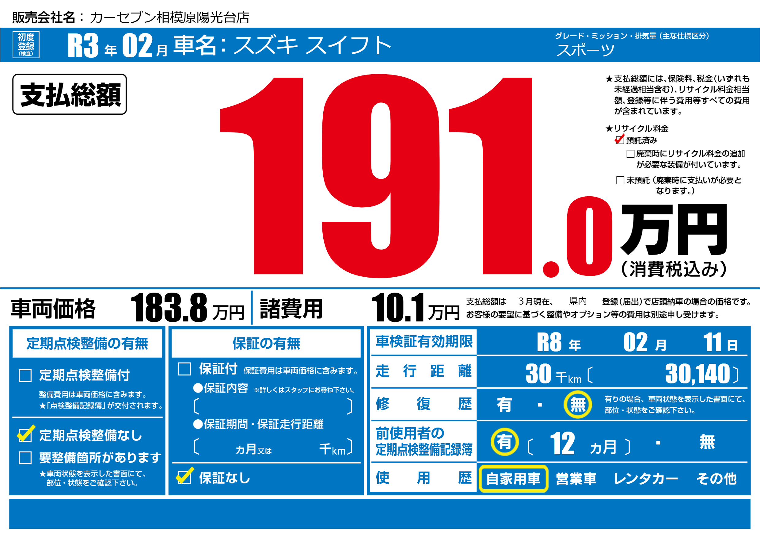 | 走行キロ | 3万km | 初年度登録 | R3年02月 |