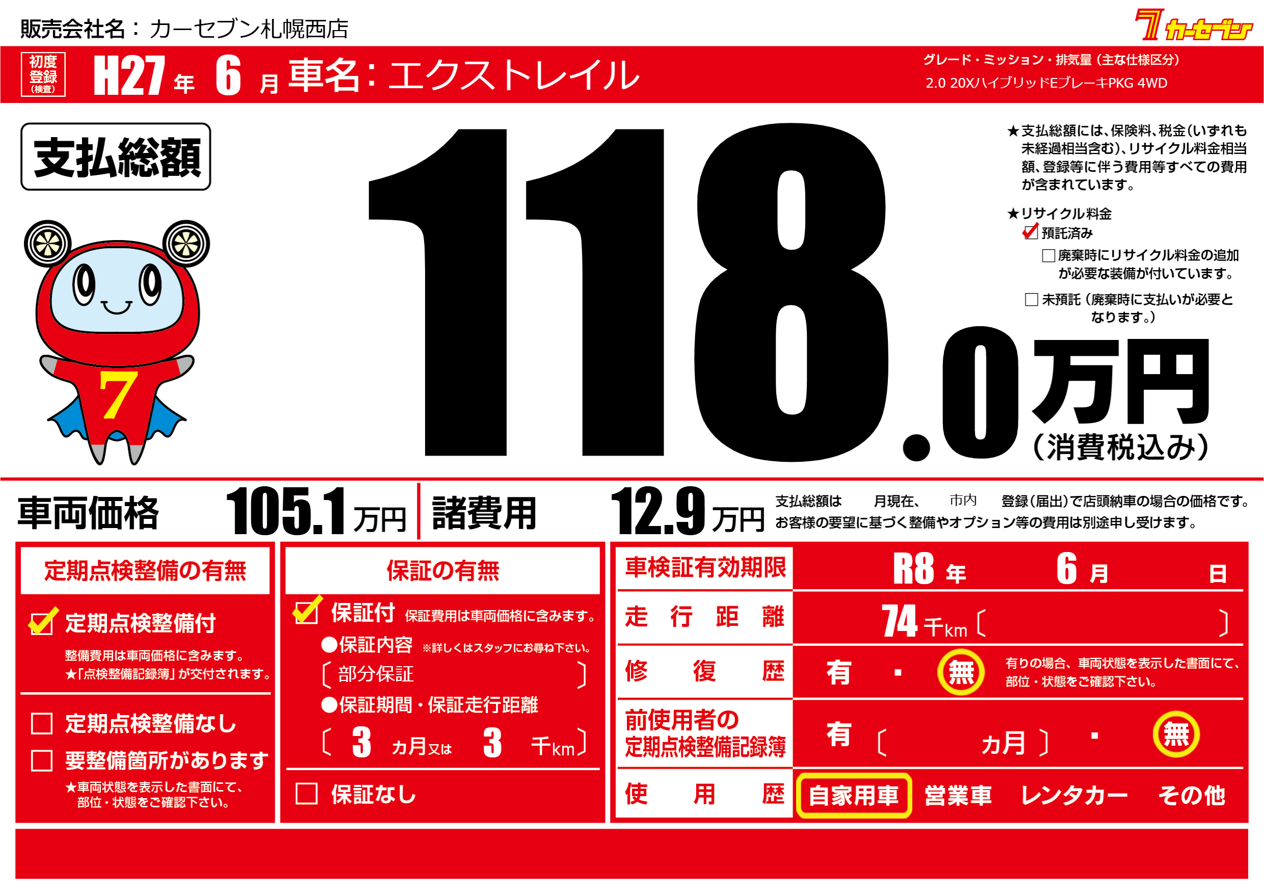 | 走行キロ | 7.4万km | 初年度登録 | H27年6月 |