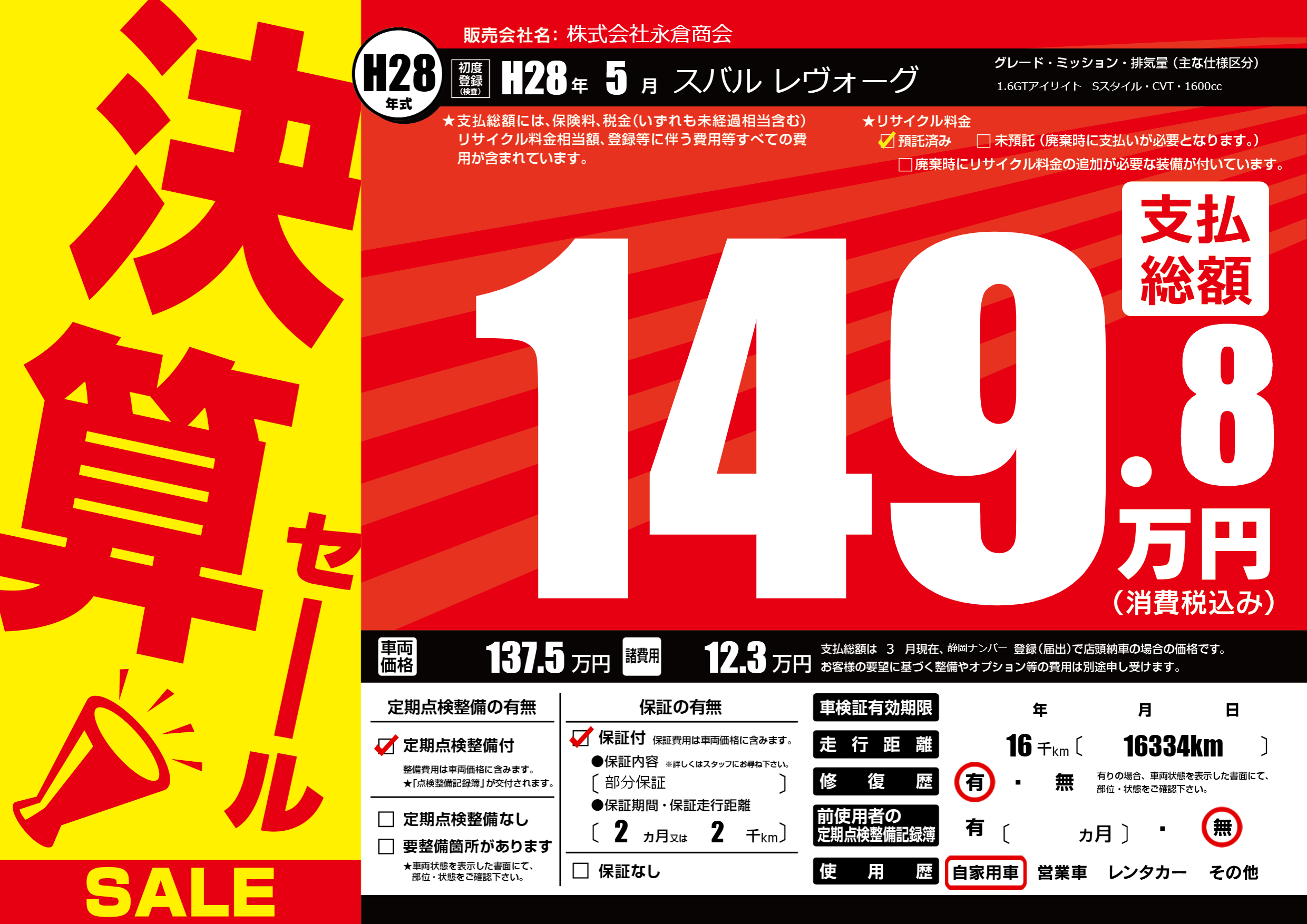 | 車名 | スバル レヴォーグ | グレード ミッション 排気量 |