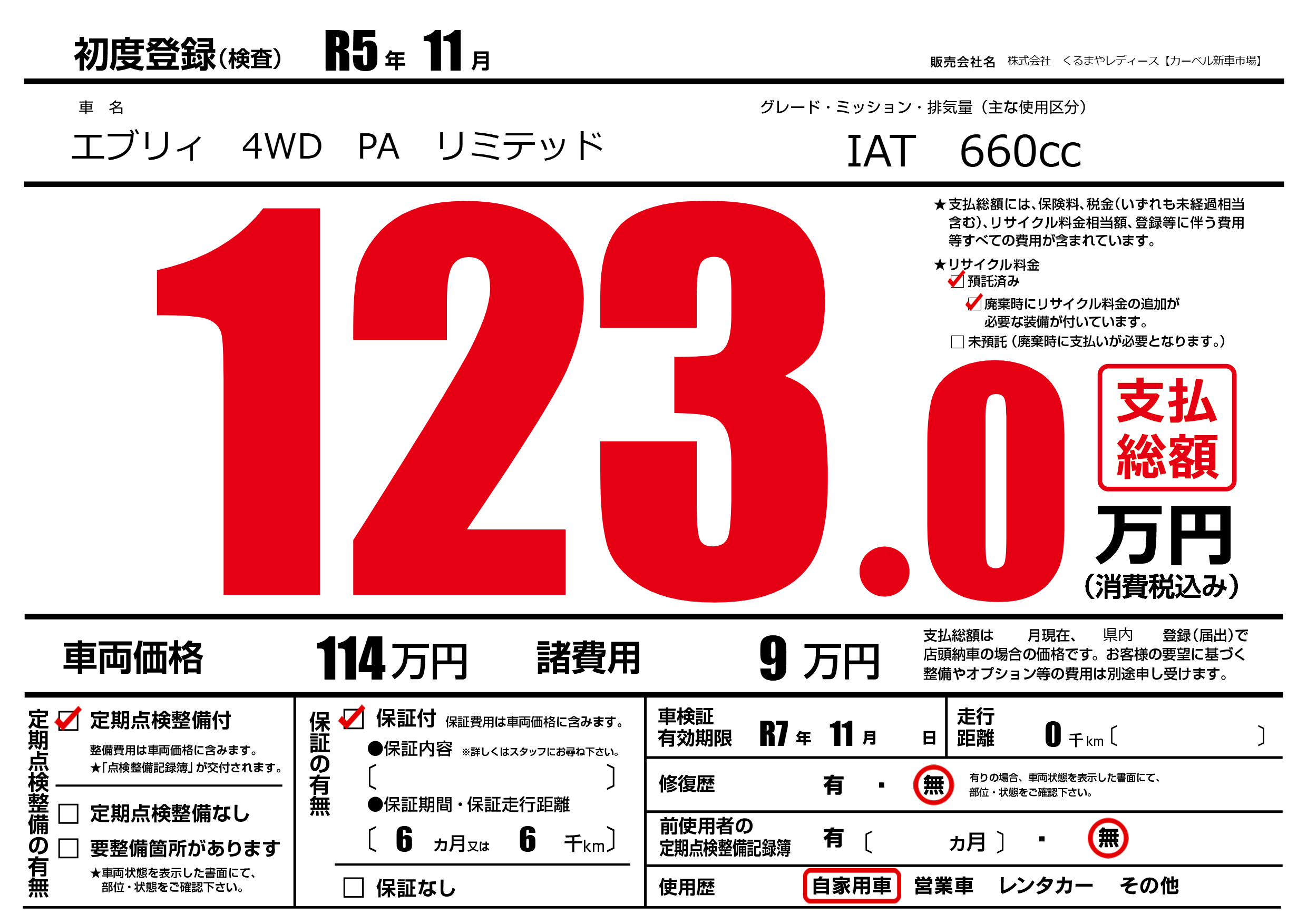 | 車名 | エブリィ 4WD PA リミテッド | グレード ミッション 排気量 |