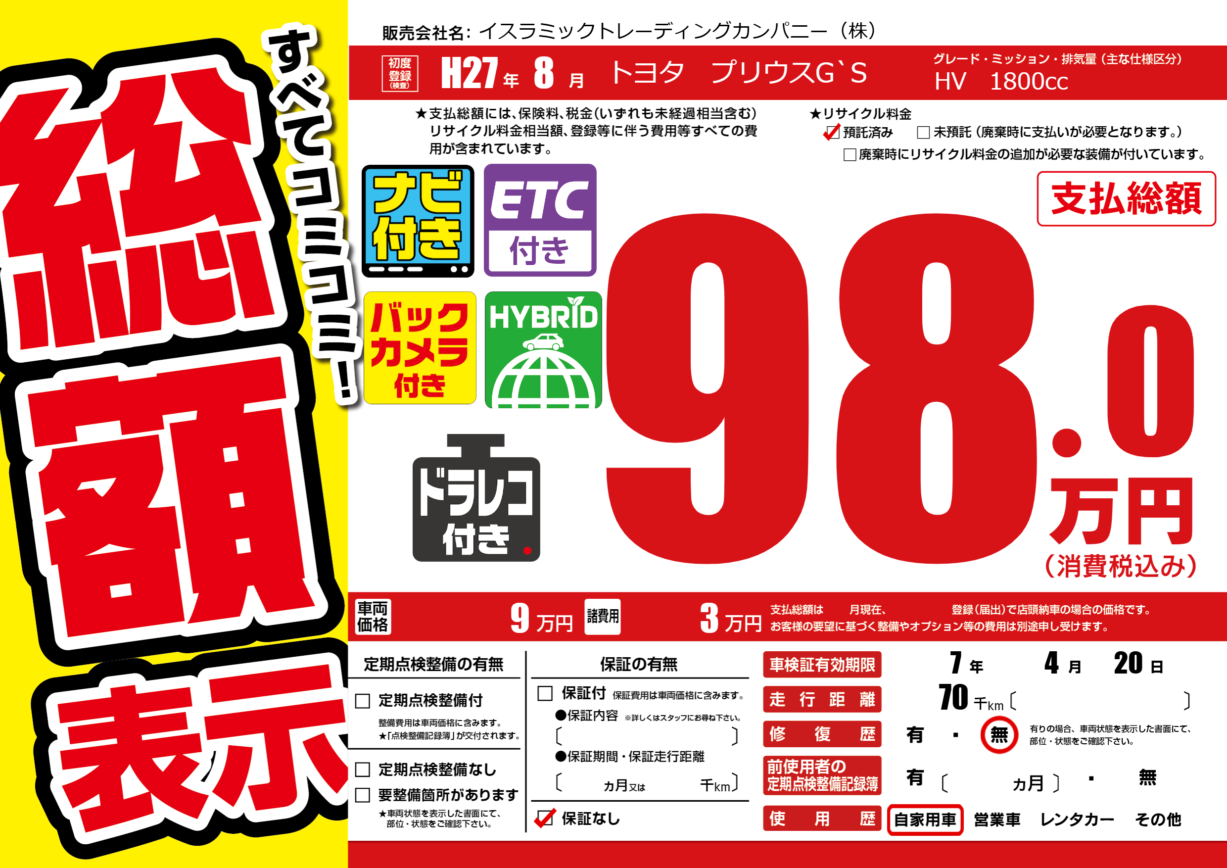 | 車名 | トヨタ プリウスG`S | グレード ミッション 排気量 |
