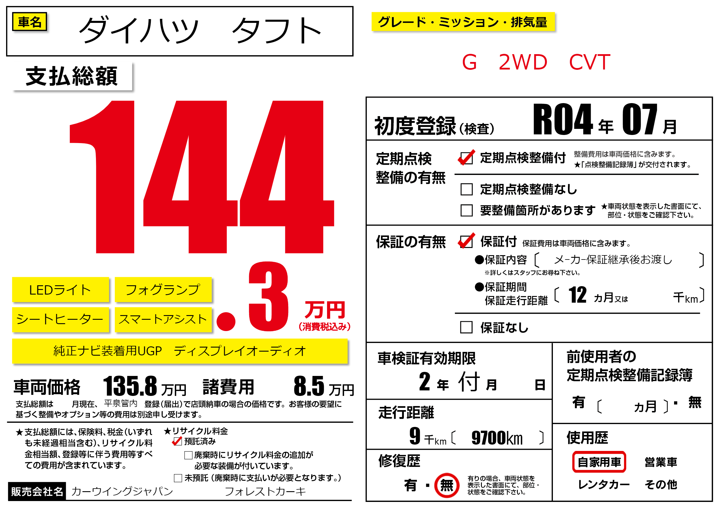 保証付き 保証内容( メーカー保証継承後お渡し) 12ヶ月または千km |