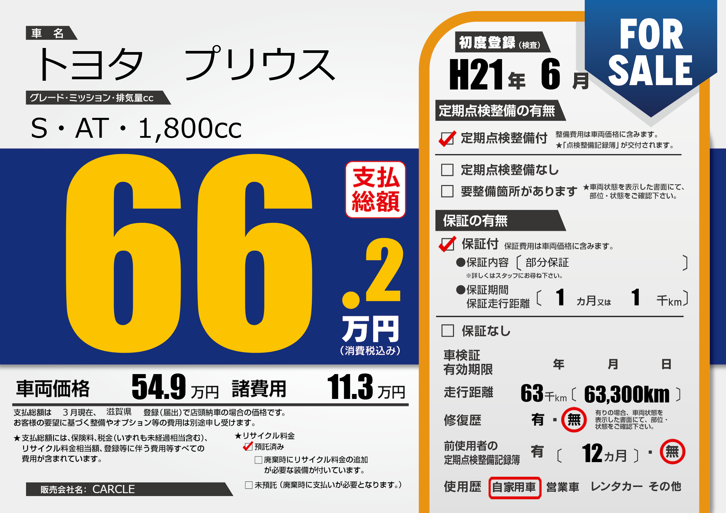| 走行キロ | 6.3万km | 初年度登録 | H21年6月 |
