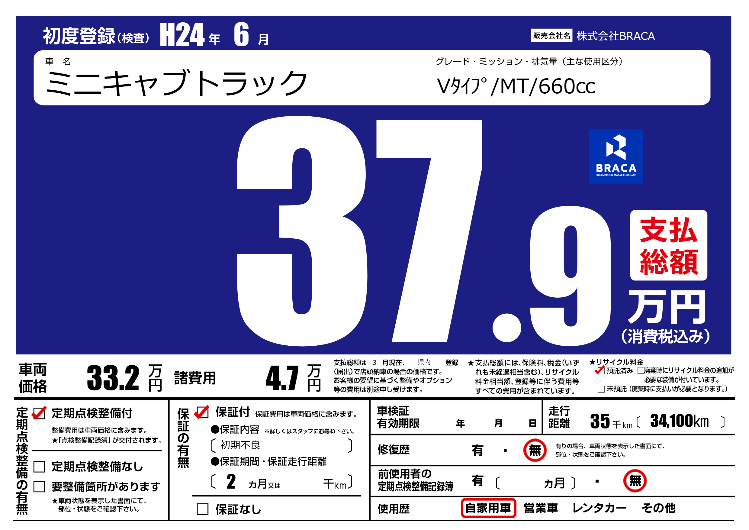 | 走行キロ | 3.5万km | 初年度登録 | H24年6月 |