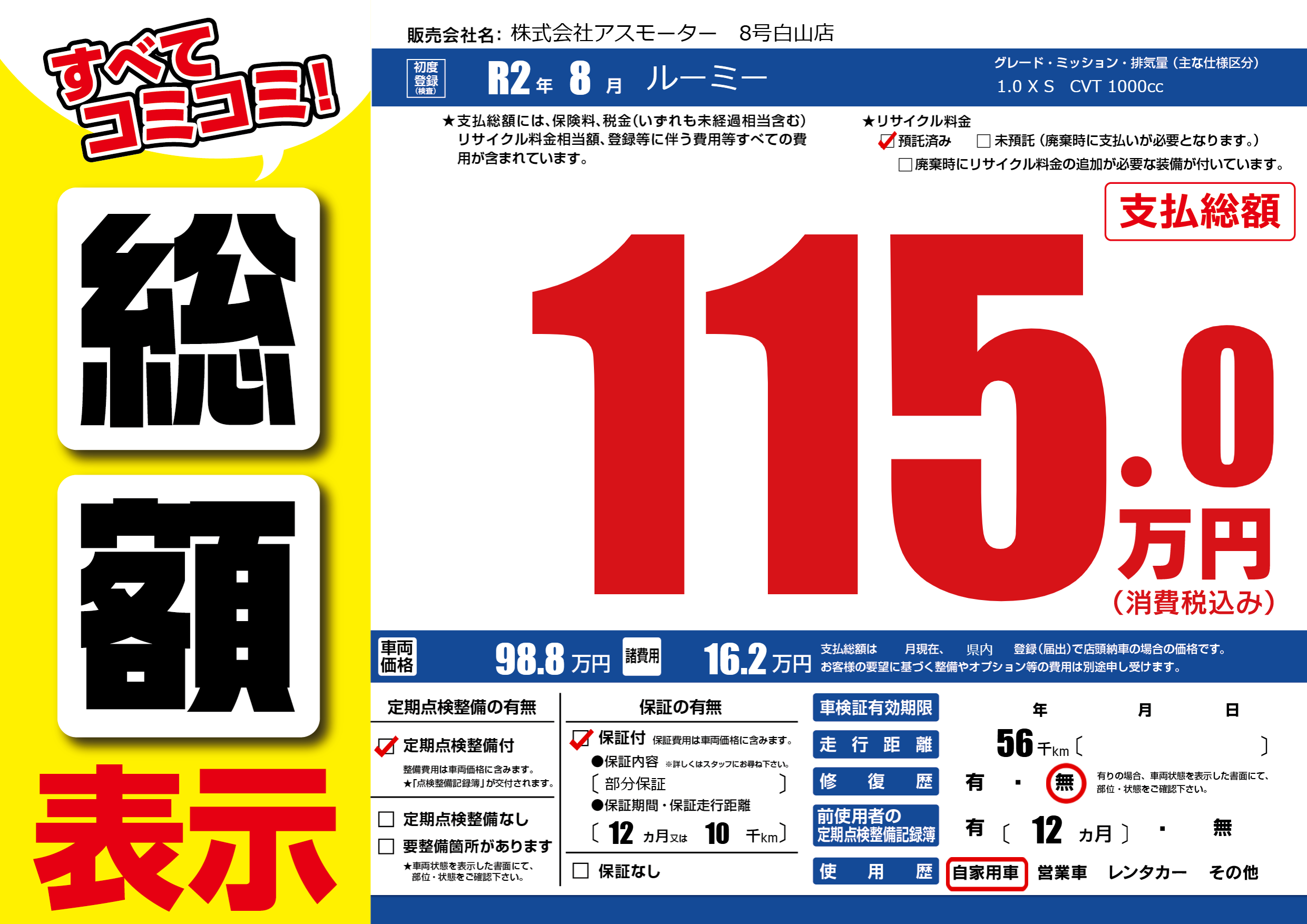| 車名 | ルーミー | グレード ミッション 排気量 |