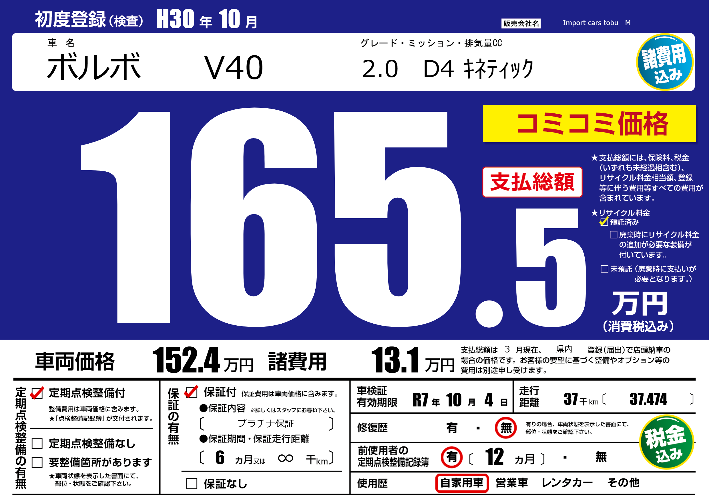 保証付き 保証内容( プラチナ保証) 6ヶ月または(∞)千kmまで |