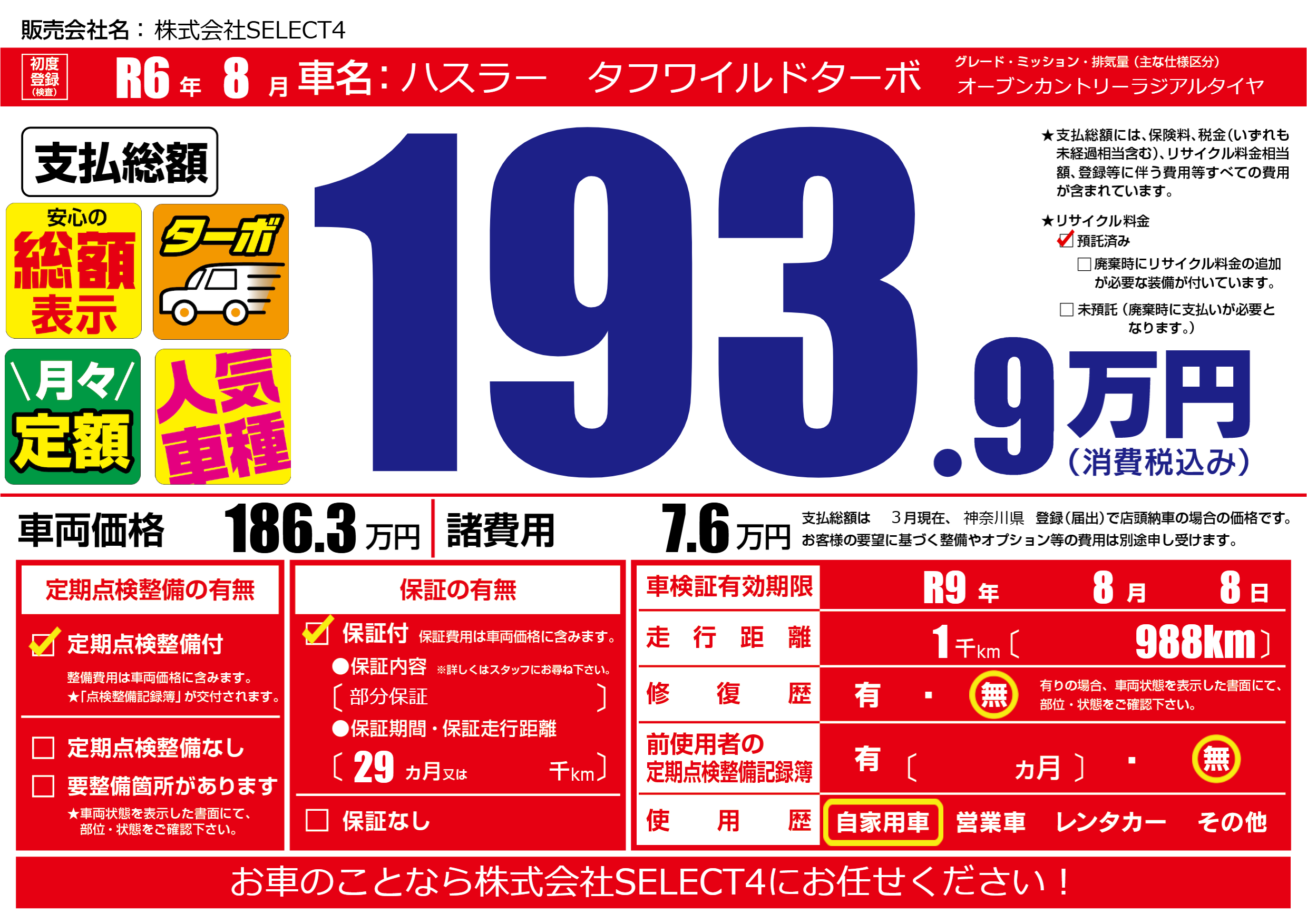 | 車名 | ハスラー タフワイルドターボ | グレード ミッション 排気量 |