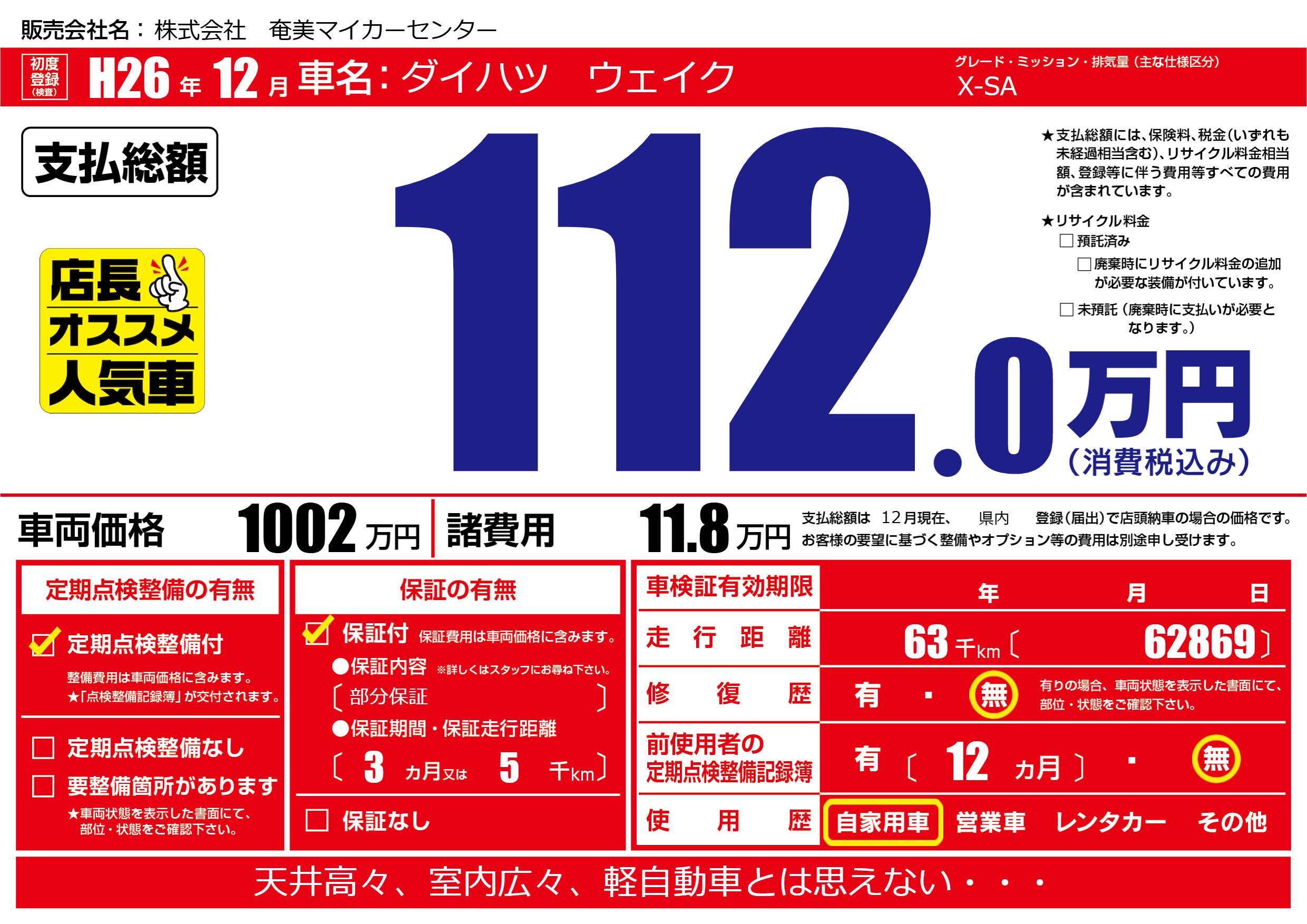 | 車名 | ダイハツ ウェイク | グレード ミッション 排気量 |