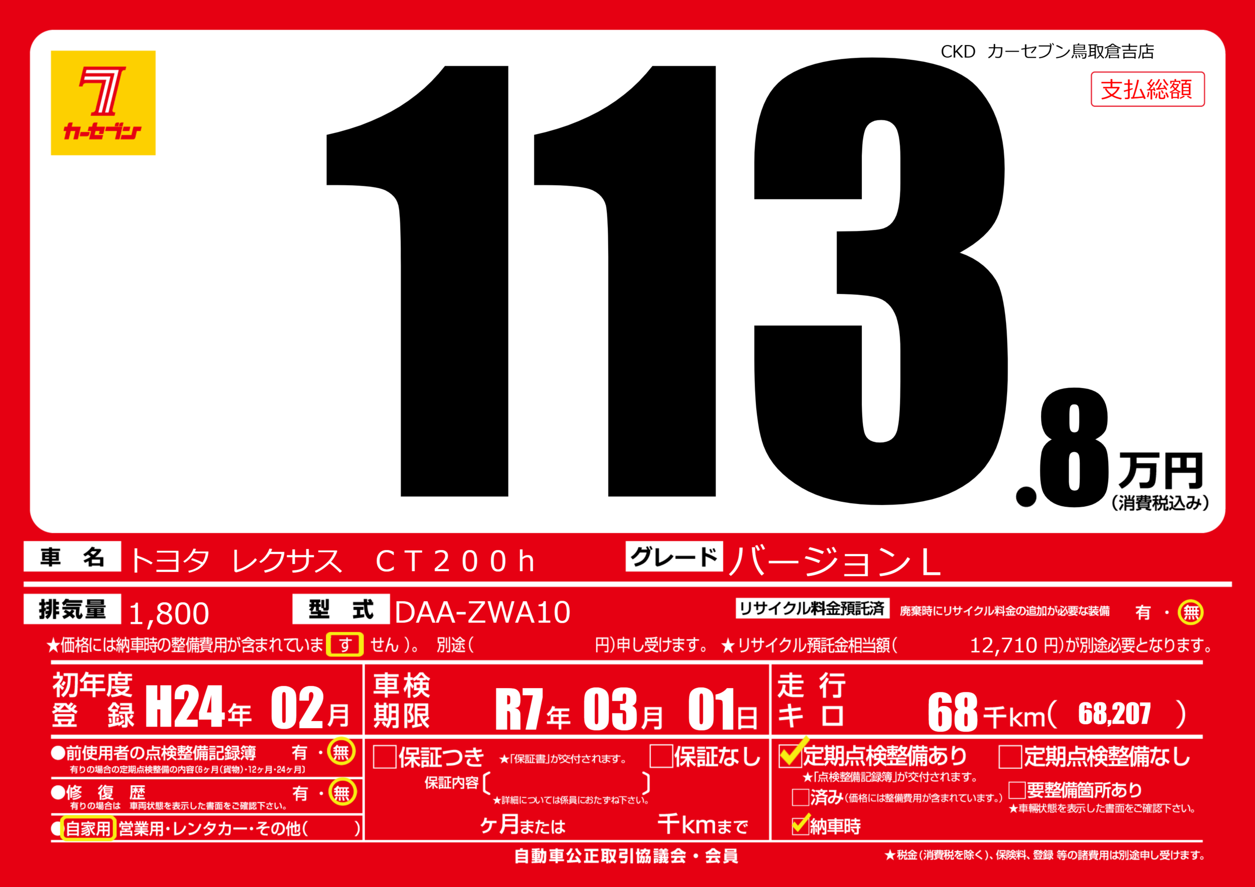 | 走行キロ | 6.8万km | 初年度登録 | H24年02月 |