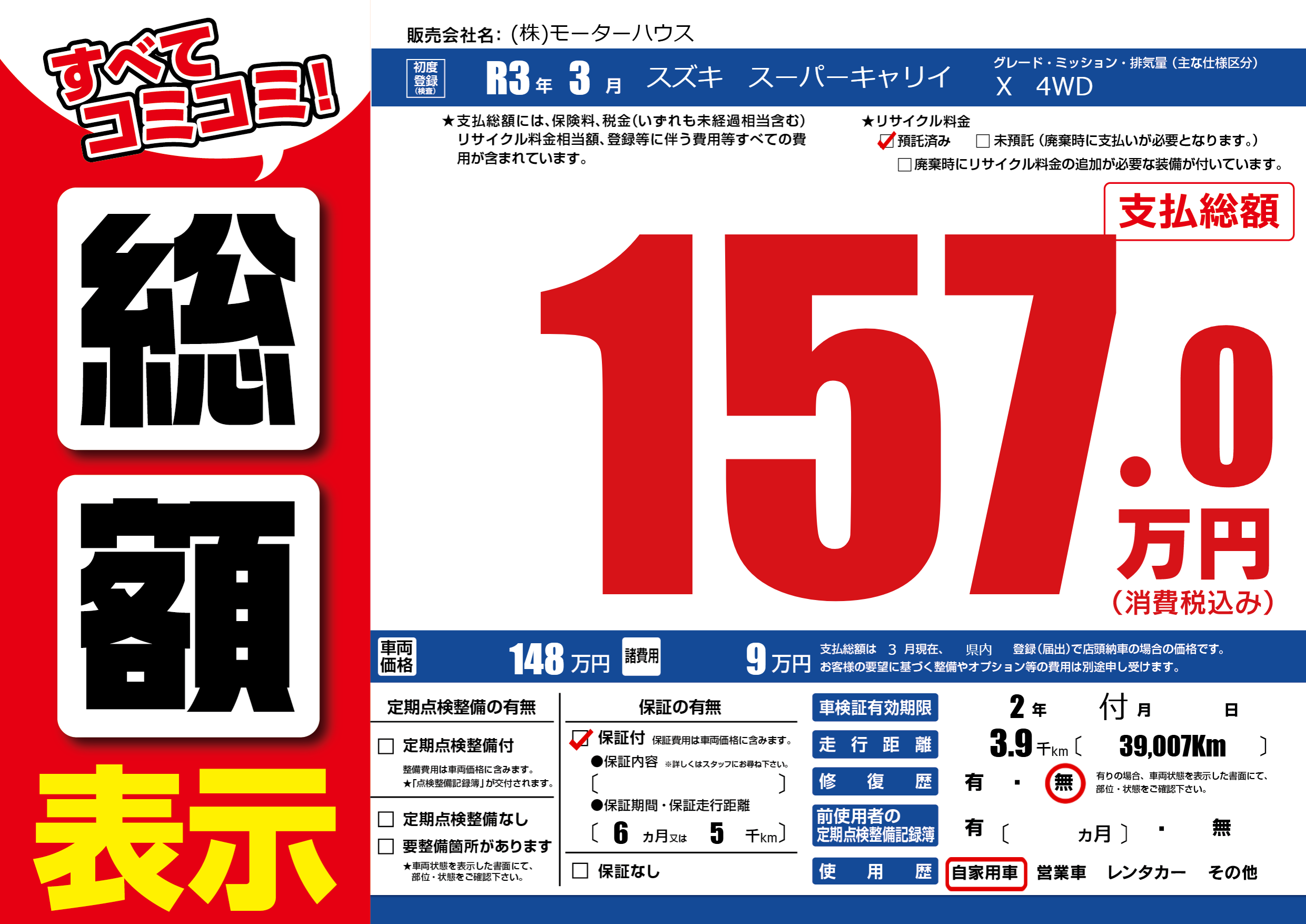| 走行キロ | 0.3万km | 初年度登録 | R3年3月 |
