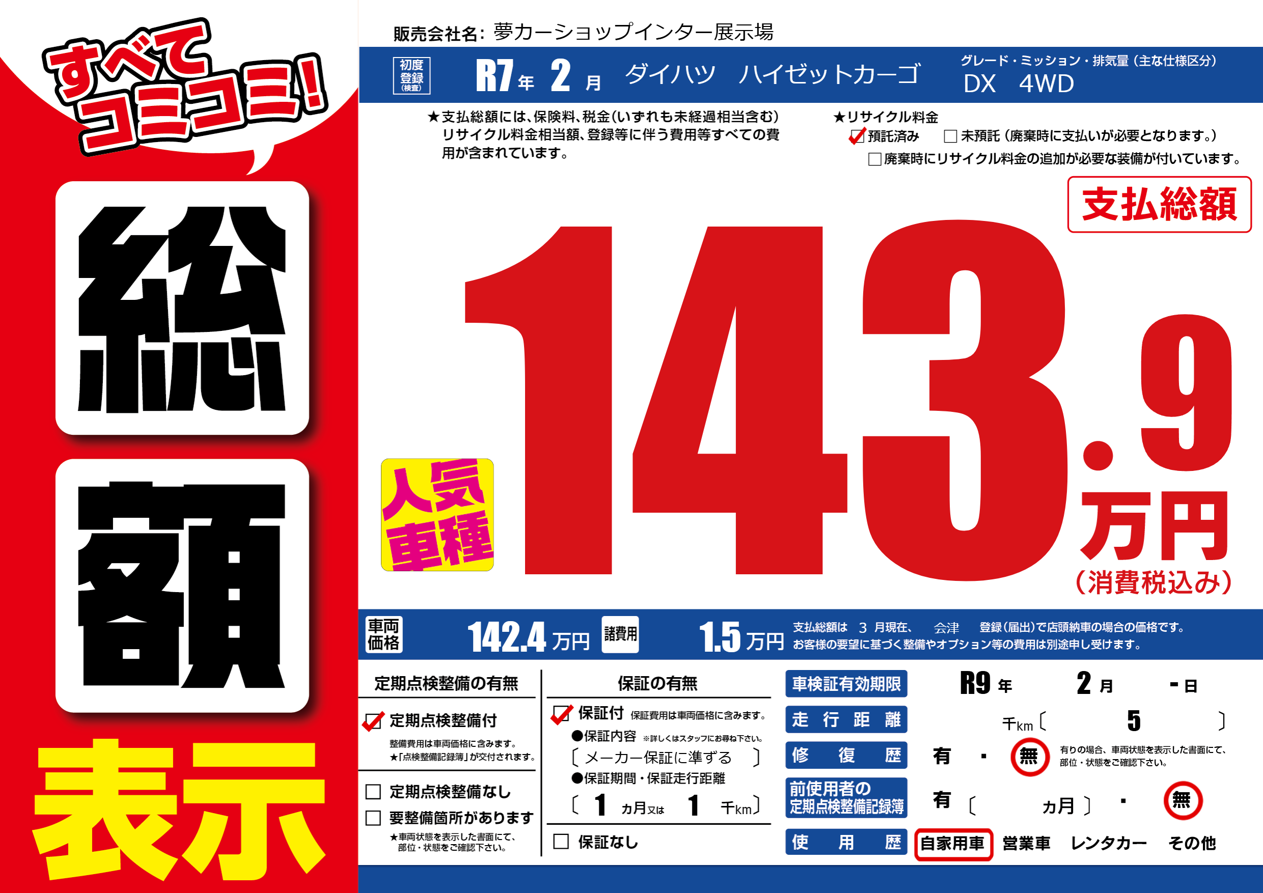 | 車検制限 | R9年 2月 -日 | ||