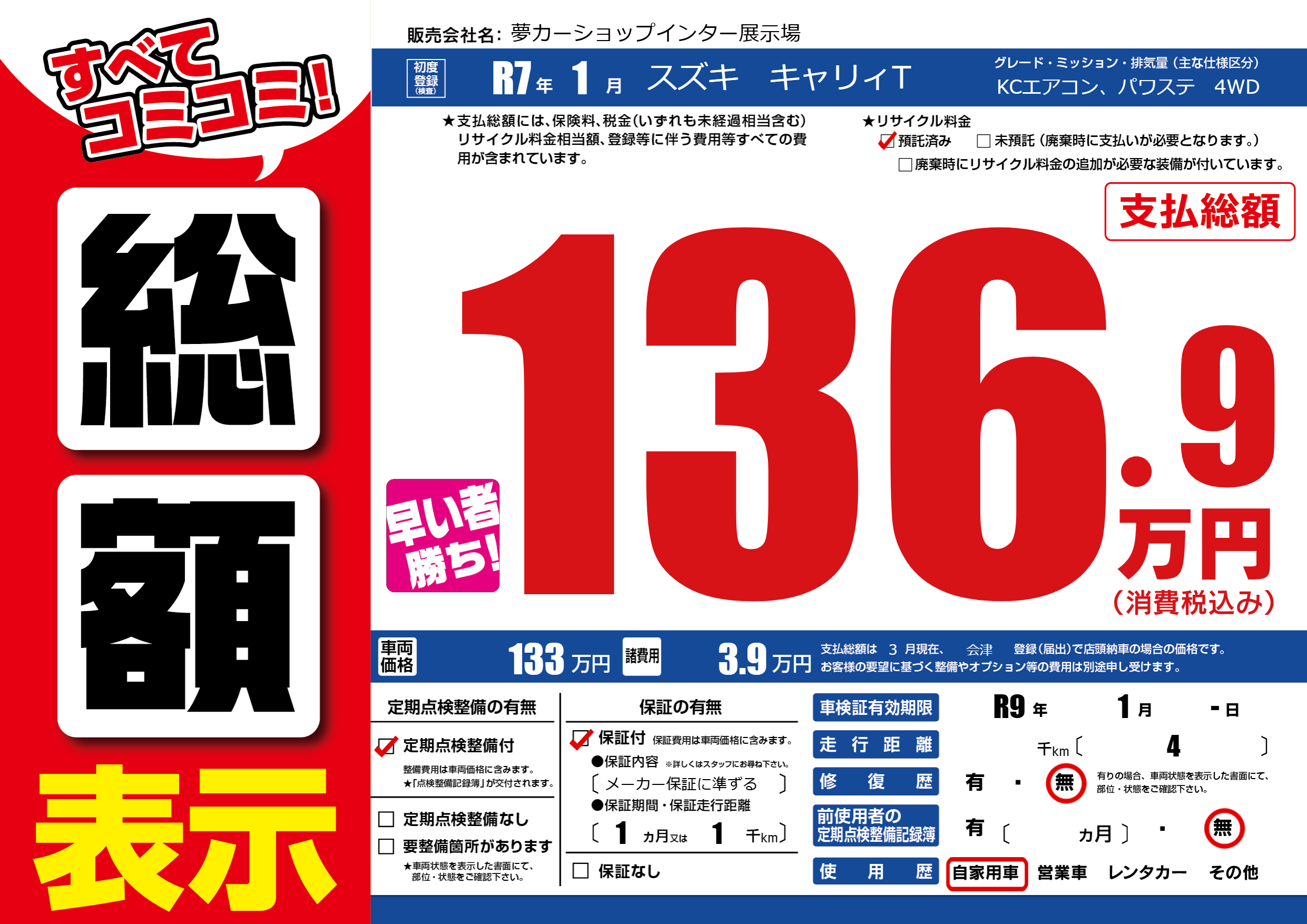 | 車検制限 | R9年 1月 -日 | ||